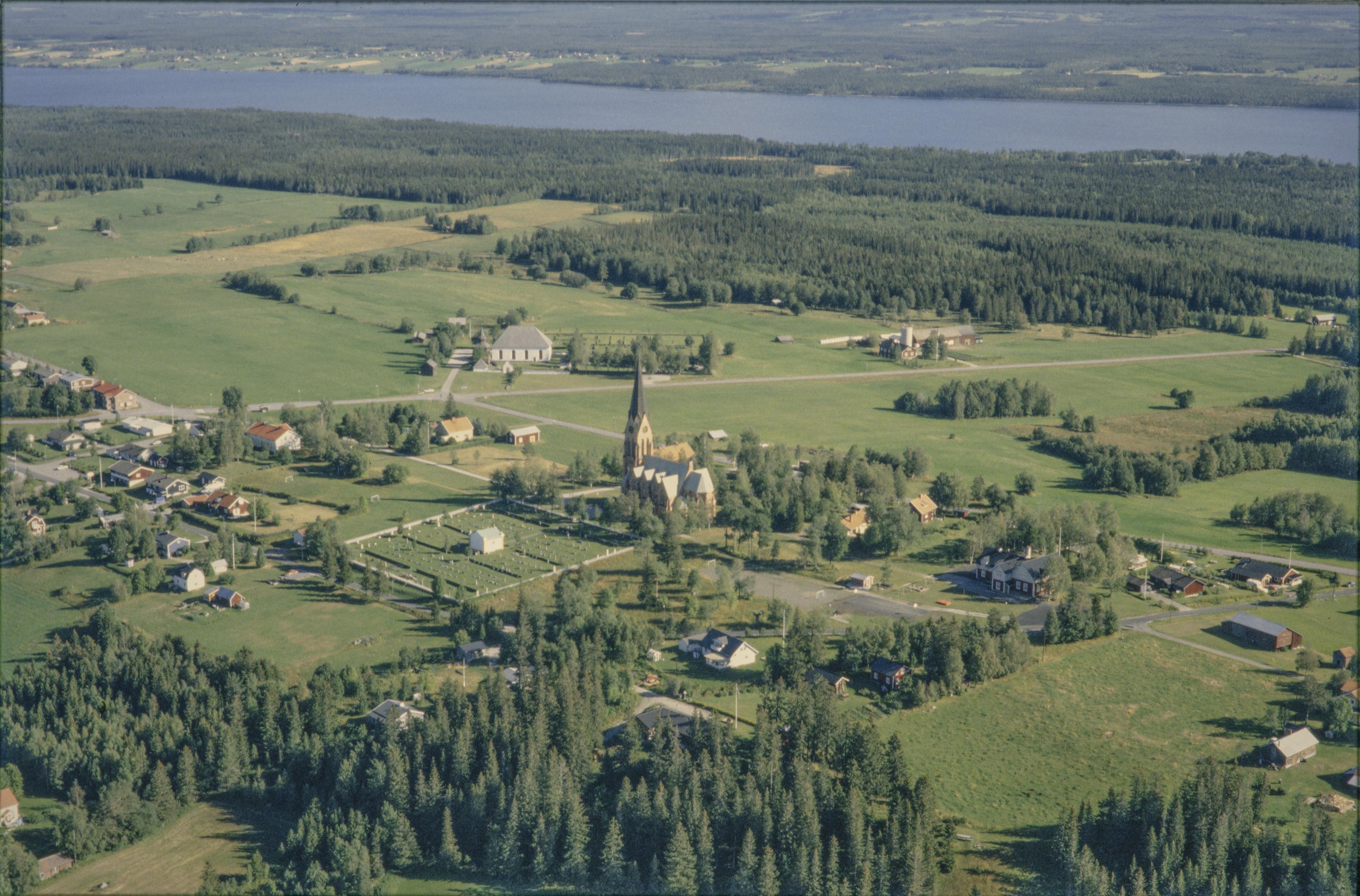 Beskrivning: Ovikens kyrkby. Ovikens nya kyrka i bildens mitt. Ovikens gamla kyrka över bildens mitt. Under bildens mitt skansruin RAÄnr Oviken 58:1 vid fossil åker Oviken 119:1 m.fl. I bildens övre kant Sannsundet i Storsjön mot socknet Hackås. Bilden är tagen mot (väderstreck): NNO