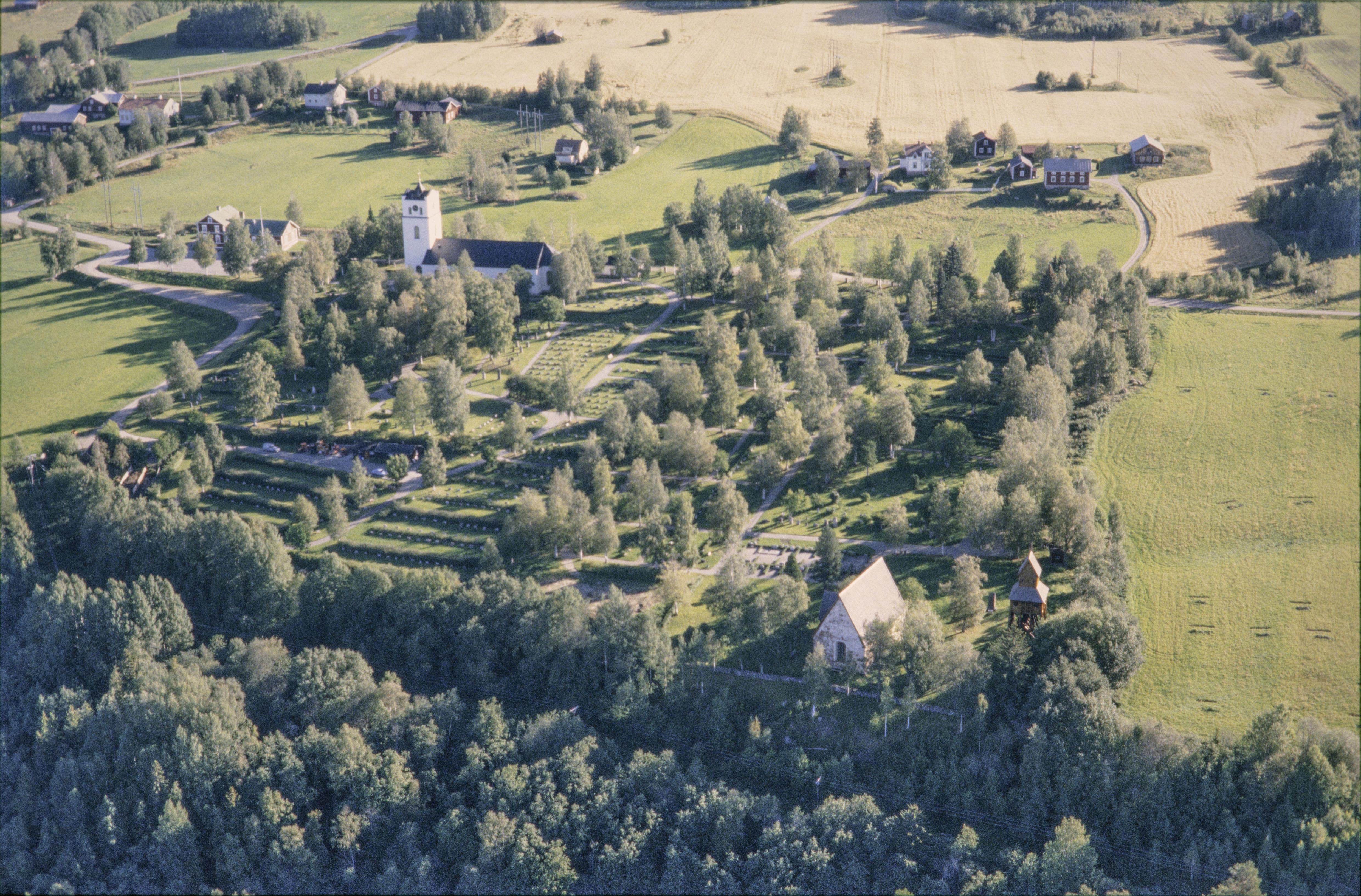 Beskrivning: Ragunda kyrkby vid Indalsälven. Nere till höger Ragunda gamla kyrka vid begravningsplats RAÄnr Ragunda 350:1. Ragunda (nya) kyrka uppe till vänster. Bilden är tagen mot (väderstreck): ONO