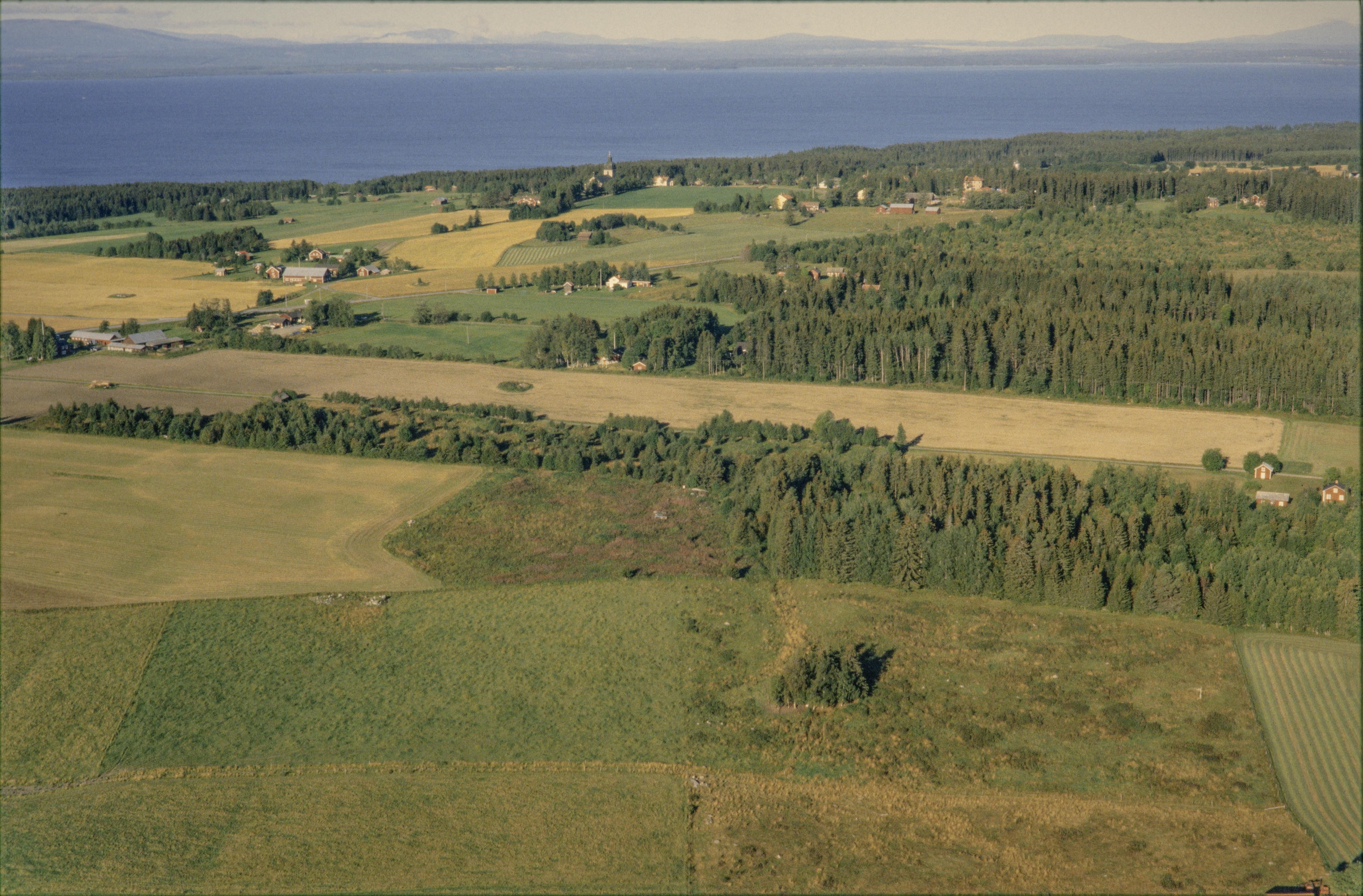 Beskrivning: Rödöns kyrkby. I bildens nedre del gravfält med högar öster om Rödöns kyrka. Högarna RAÄnr Rödön 41:1, 42:1, 43:1 m.fl, I bildens övre del Rödöns kyrka vid Storsjön. Bilden är tagen mot (väderstreck): V