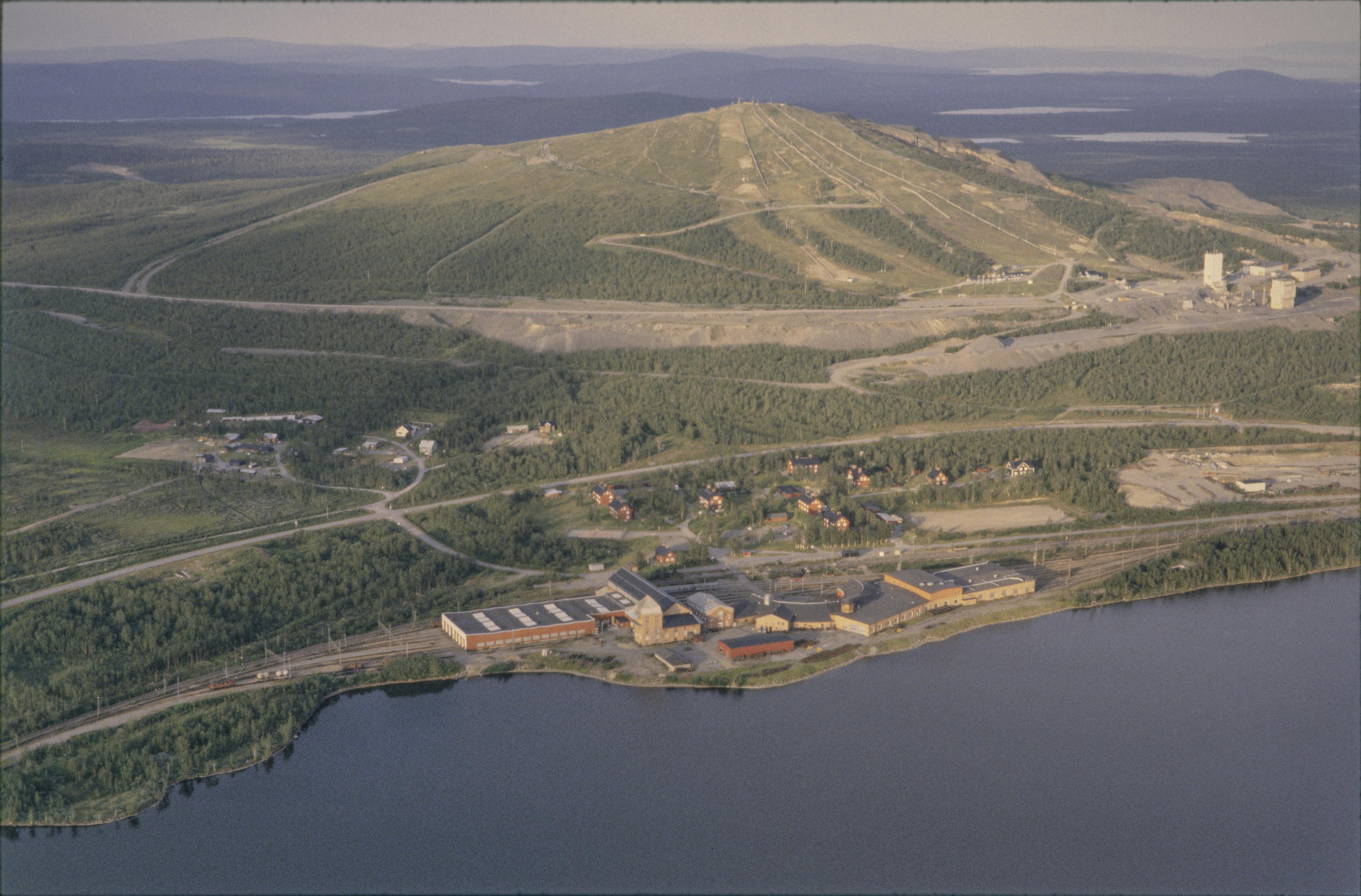 Beskrivning: Kiruna (Giron) tätort och gruvsamhälle. I bildens övre del gruvfjället Luossavaara (Luossavárri). I vänstra bildkant gruvområdet RAÄnr Jukkasjärvi 2471. Bilden är tagen mot (väderstreck): ONO