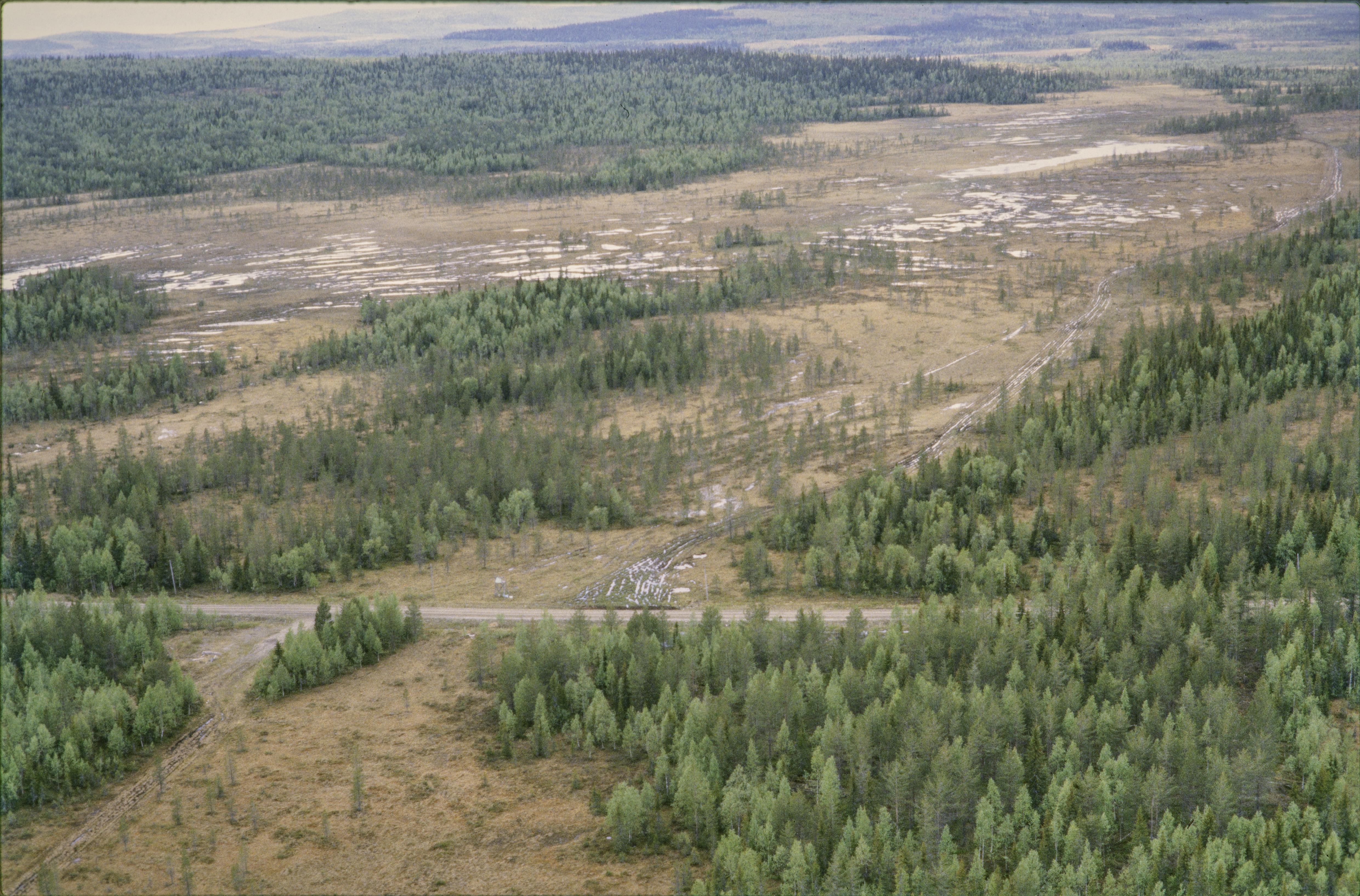 Beskrivning: Spår med terrängfordon på Tjärnmyran, söder om Fäbodlidens by. I bildens övre kant Storfatmyran med härdlämning RAÄnr Lycksele 257:1. Bilden är tagen mot (väderstreck): VNV