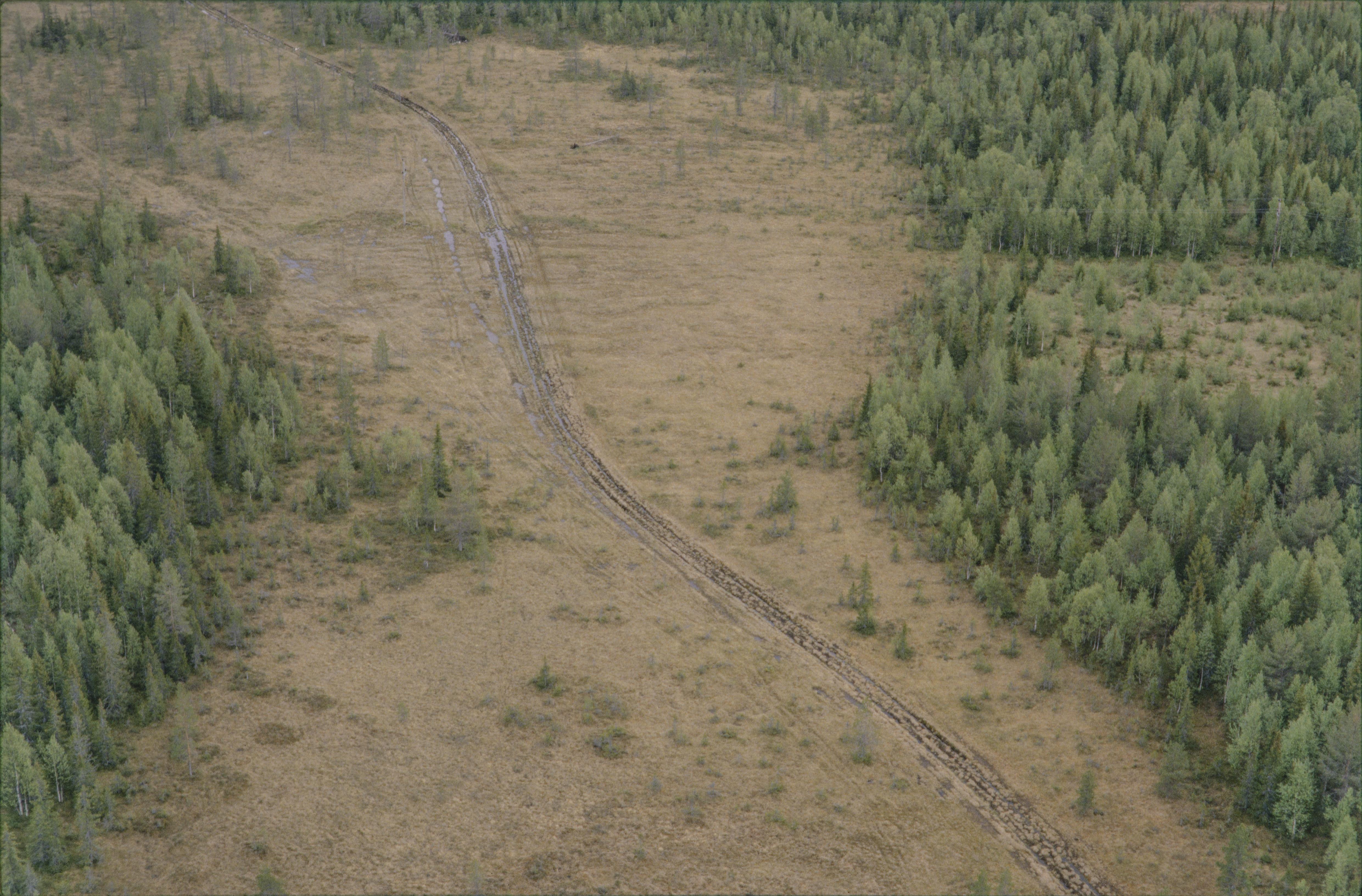 Beskrivning: Spår med terrängfordon på Tjärnmyran, söder om Fäbodlidens by. Bilden är tagen mot (väderstreck): OSO