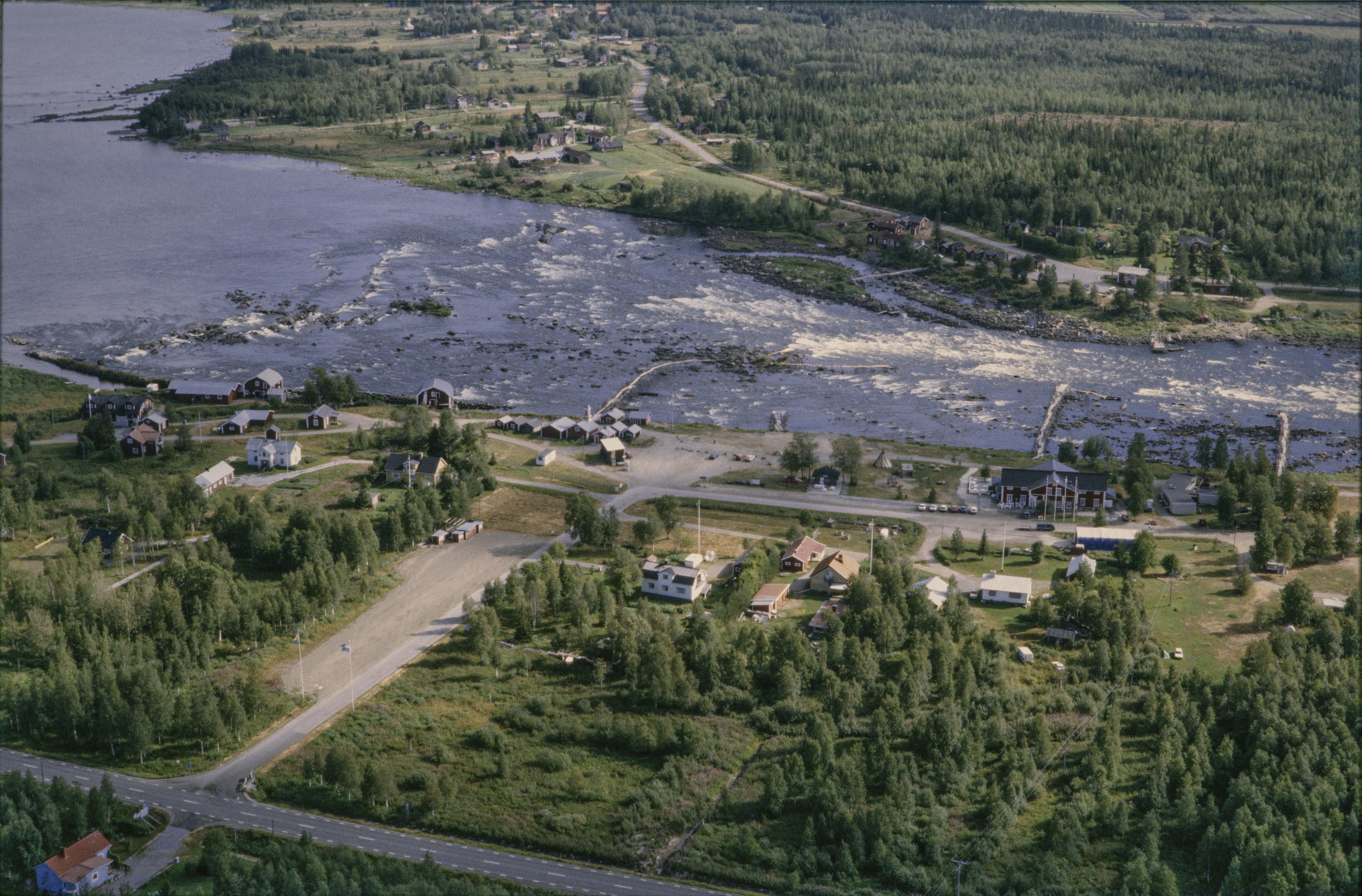Beskrivning: Kukkola (Koskenpää) by i Tornedalen. Riksgränsen mot Finland över bildens mitt. Längs bildens mitt Kukkolaforsen i Torneälven. Till vänster under bildens mitt kalkugn RAÄnr Karl Gustav 182:1. Bilden är tagen mot (väderstreck): NO