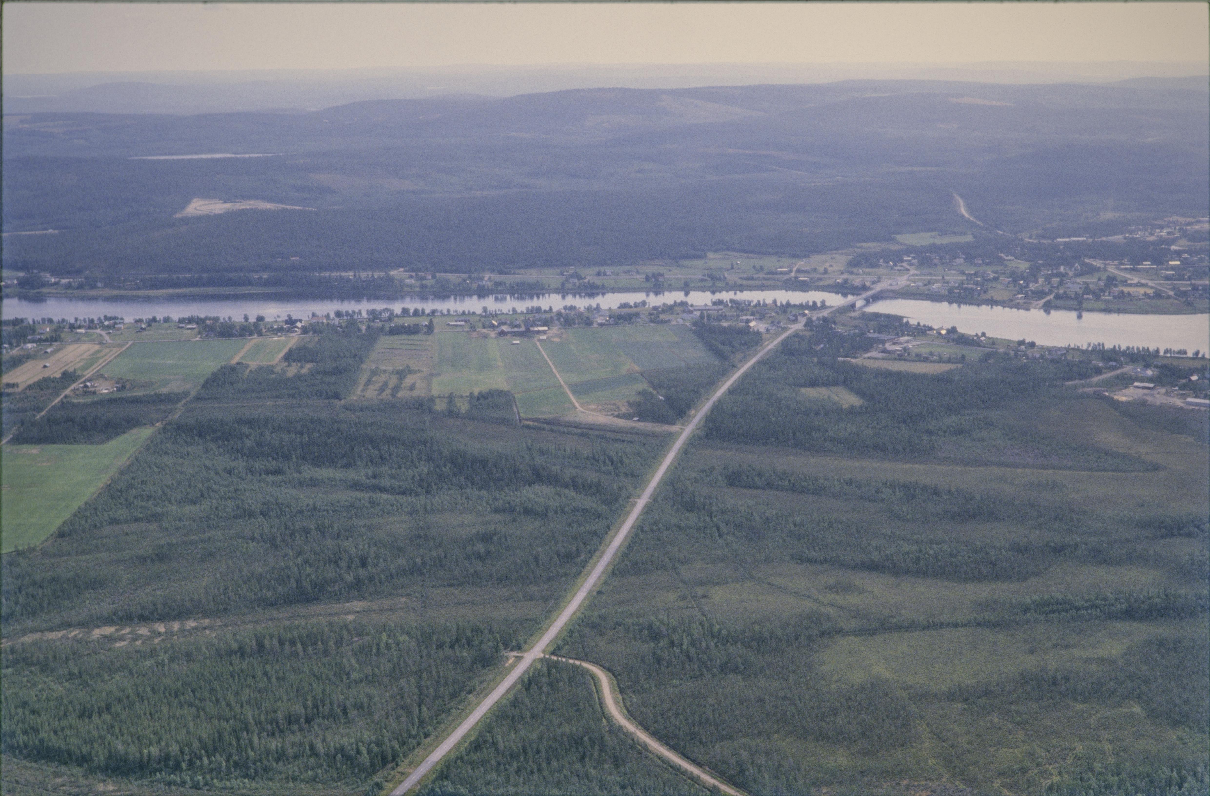 Beskrivning: Tornedalen. Vid vägen i bildens nedre kant boplatsgrop RAÄnr Övertorneå 314:1 och härd Övertorneå 315:1. Tätorten Pello vid Torneälven över bildens mitt. Torneälven markerar riksgränsen mot Finland (i bildens övre del). Bilden är tagen mot (väderstreck): Ö