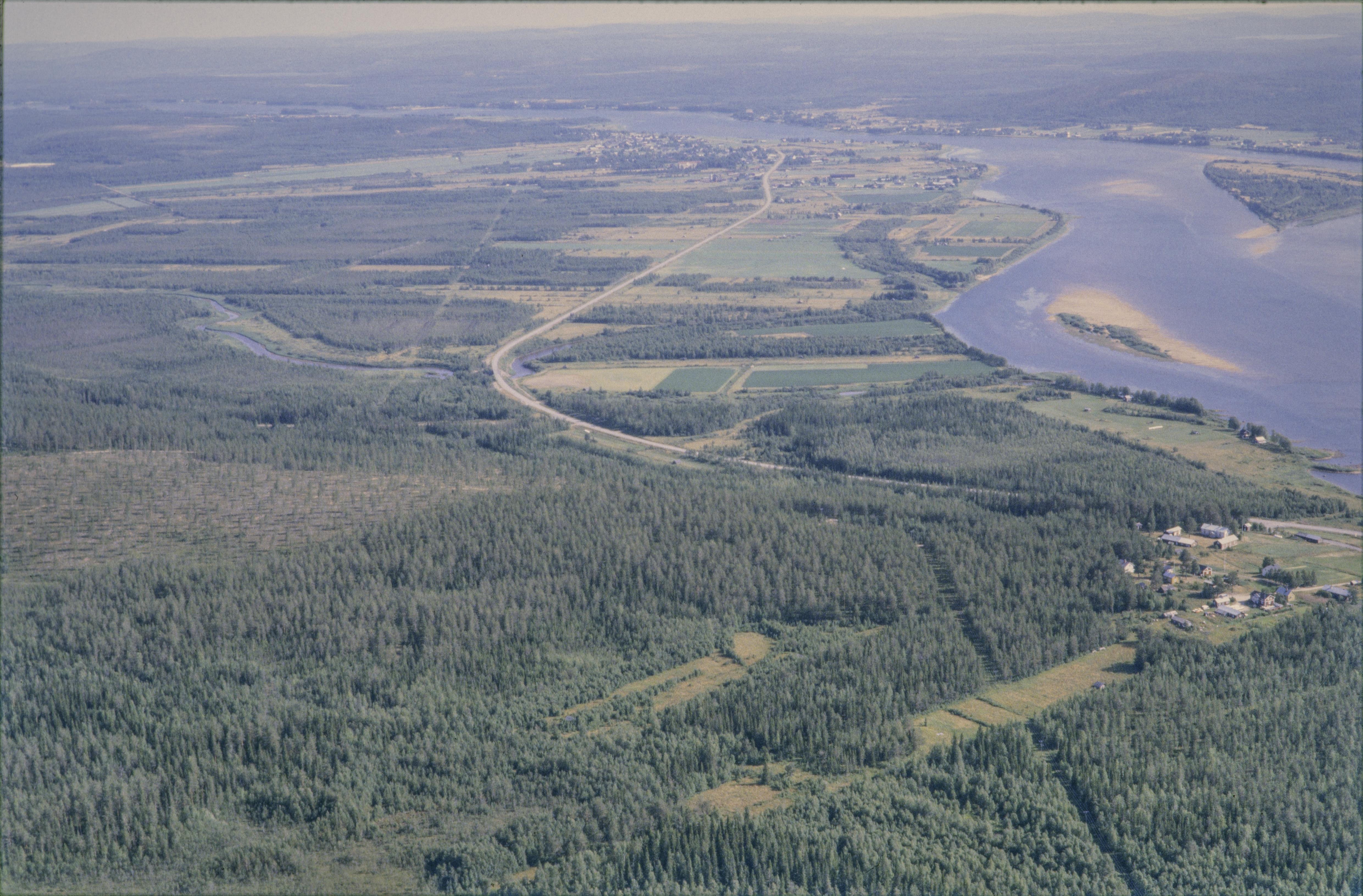 Beskrivning: Torneälven i Tornedalen. I bildens nedre del byn Niskanpää söder om ån Juovojas mynning. Vid Juovoja till vänster om bildens mitt tjärdal / tjärgrop RAÄnr Övertorneå 532:1-3. Över bildens mitt byn Juoksengi (Juoksenki). Torneälven markerar riksgränsen mot Finland (uppe till höger). Bilden är tagen mot (väderstreck): NNO