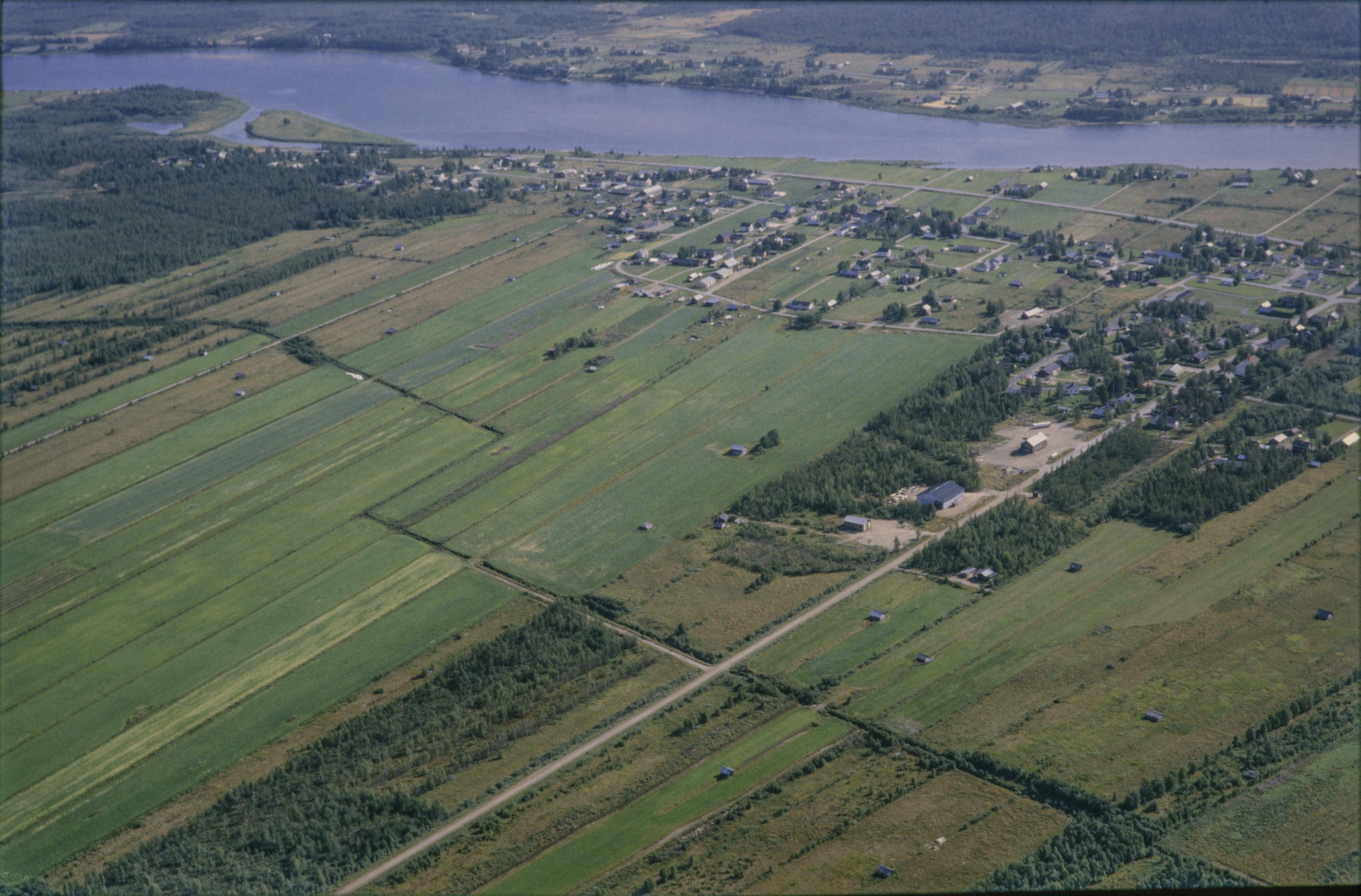 Beskrivning: Torneälven i Tornedalen. Byn Juoksengi (Juoksenki). Uppe vid älvstranden till vänster en tjärdal / tjärgrop RAÄnr Övertorneå 517:1 vid kokgrop Övertorneå 505:1. Torneälven markerar riksgränsen mot Finland (i bildens övre del). Bilden är tagen mot (väderstreck): ONO