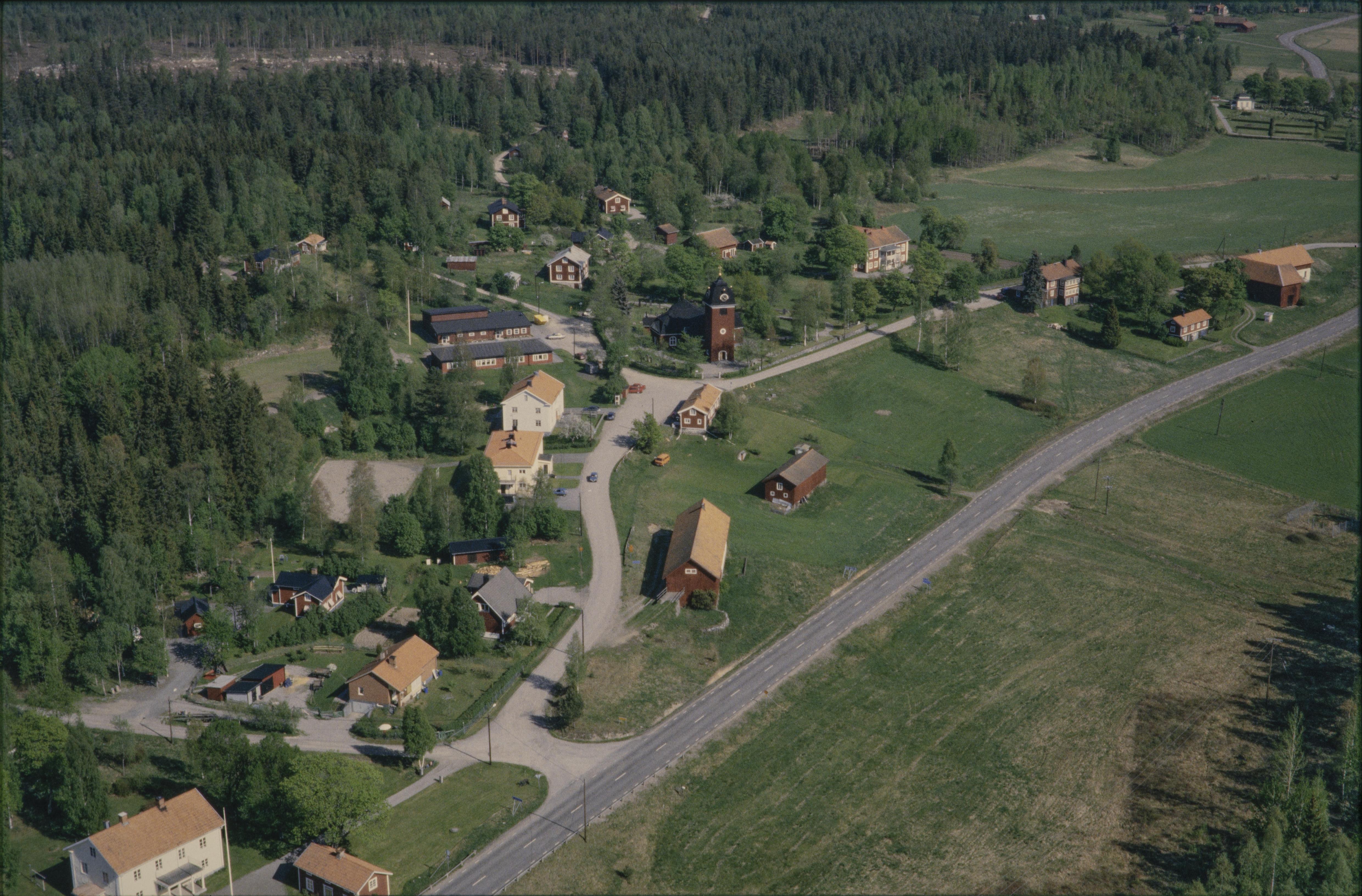 Beskrivning: Hjulsjö kyrkby. Hjulsjö kyrka över bildens mitt. Bilden är tagen mot (väderstreck): OSO