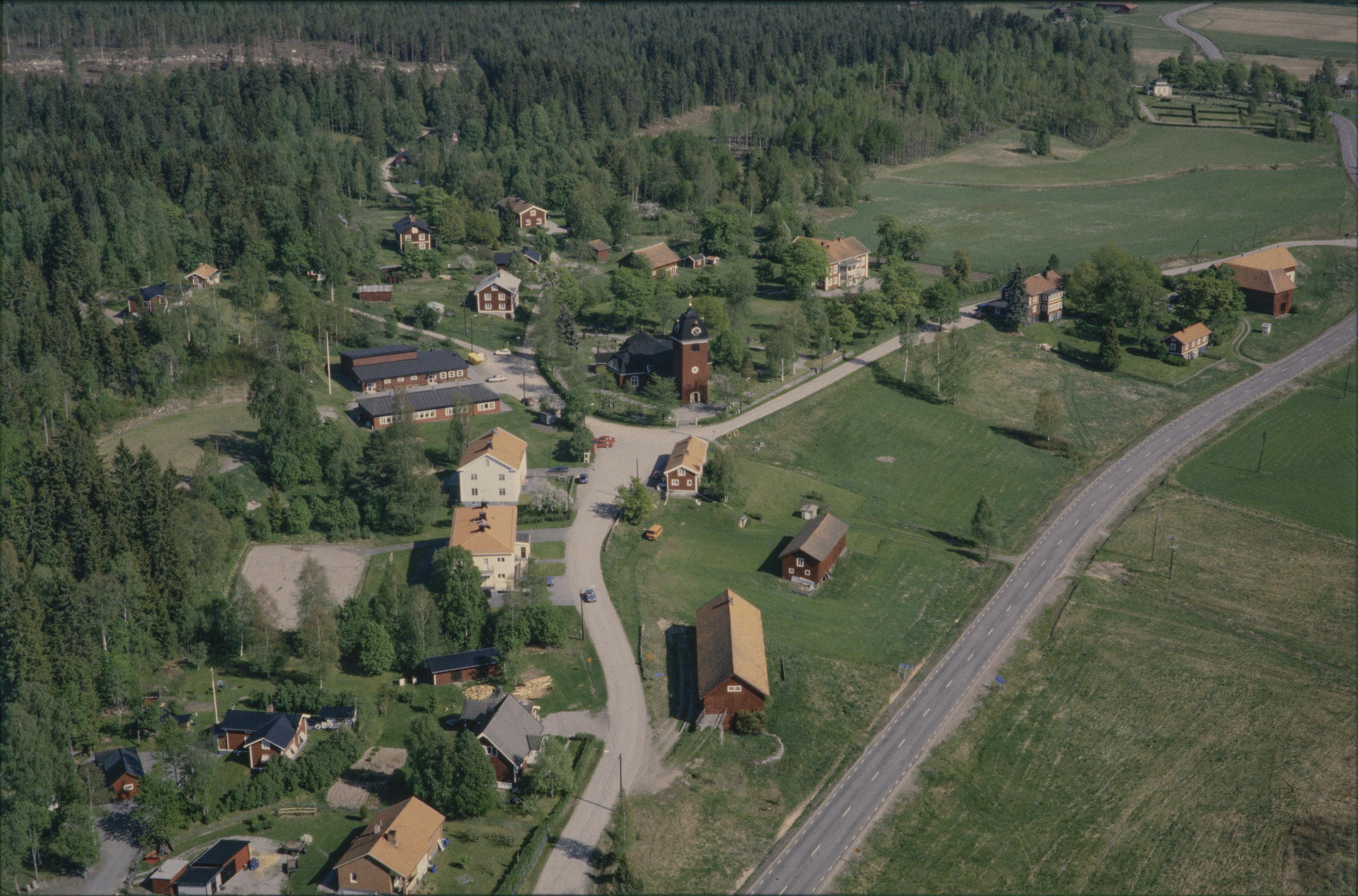 Beskrivning: Hjulsjö kyrkby. Hjulsjö kyrka över bildens mitt. Bilden är tagen mot (väderstreck): OSO