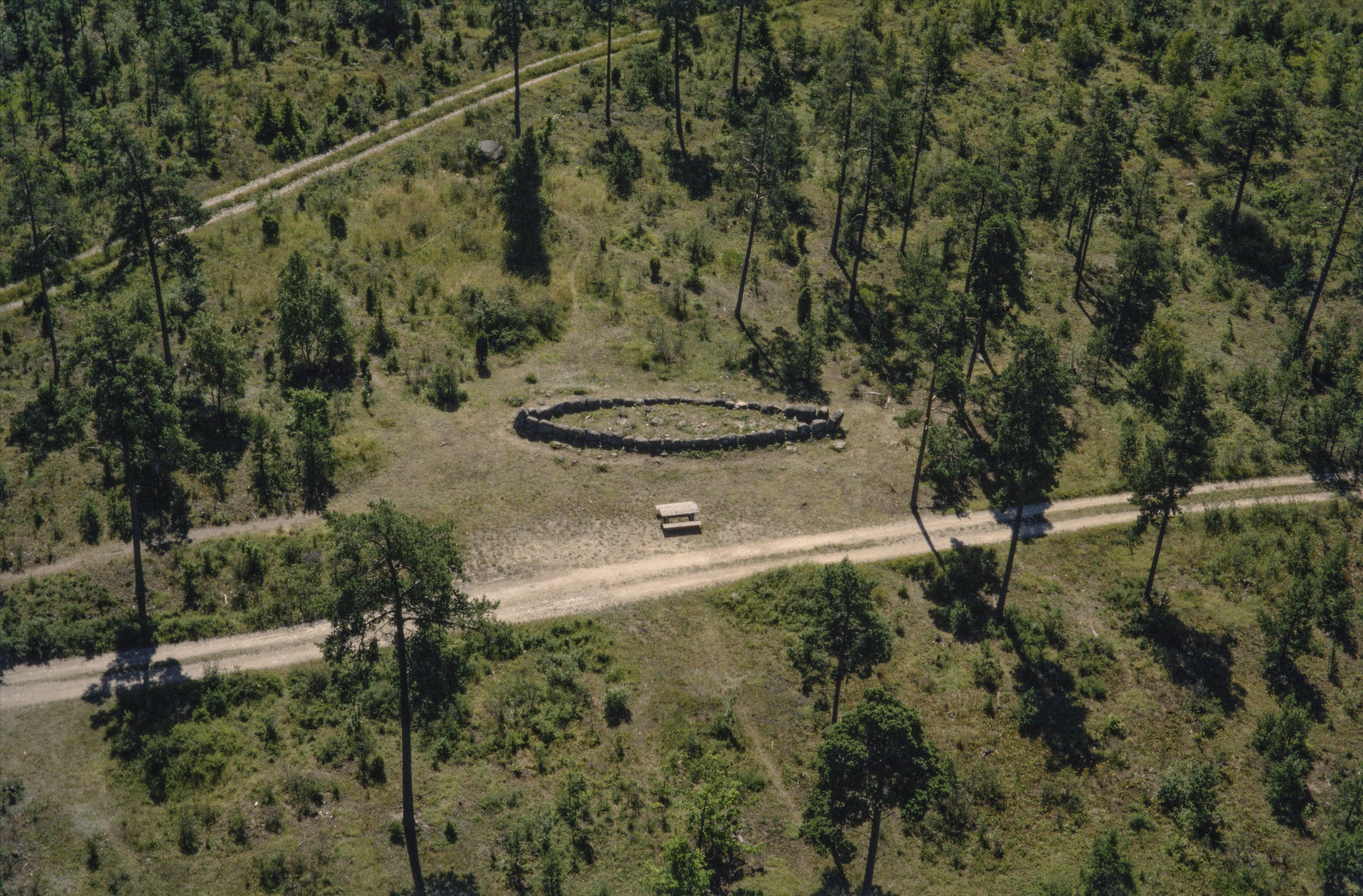 Beskrivning: Skeppssättningen Tjelvars grav RAÄnr Boge 28:1 i skogen vid Millhagen i Gothems socken, norr om gränsen mot Boge socken. Bilden är tagen mot (väderstreck): S