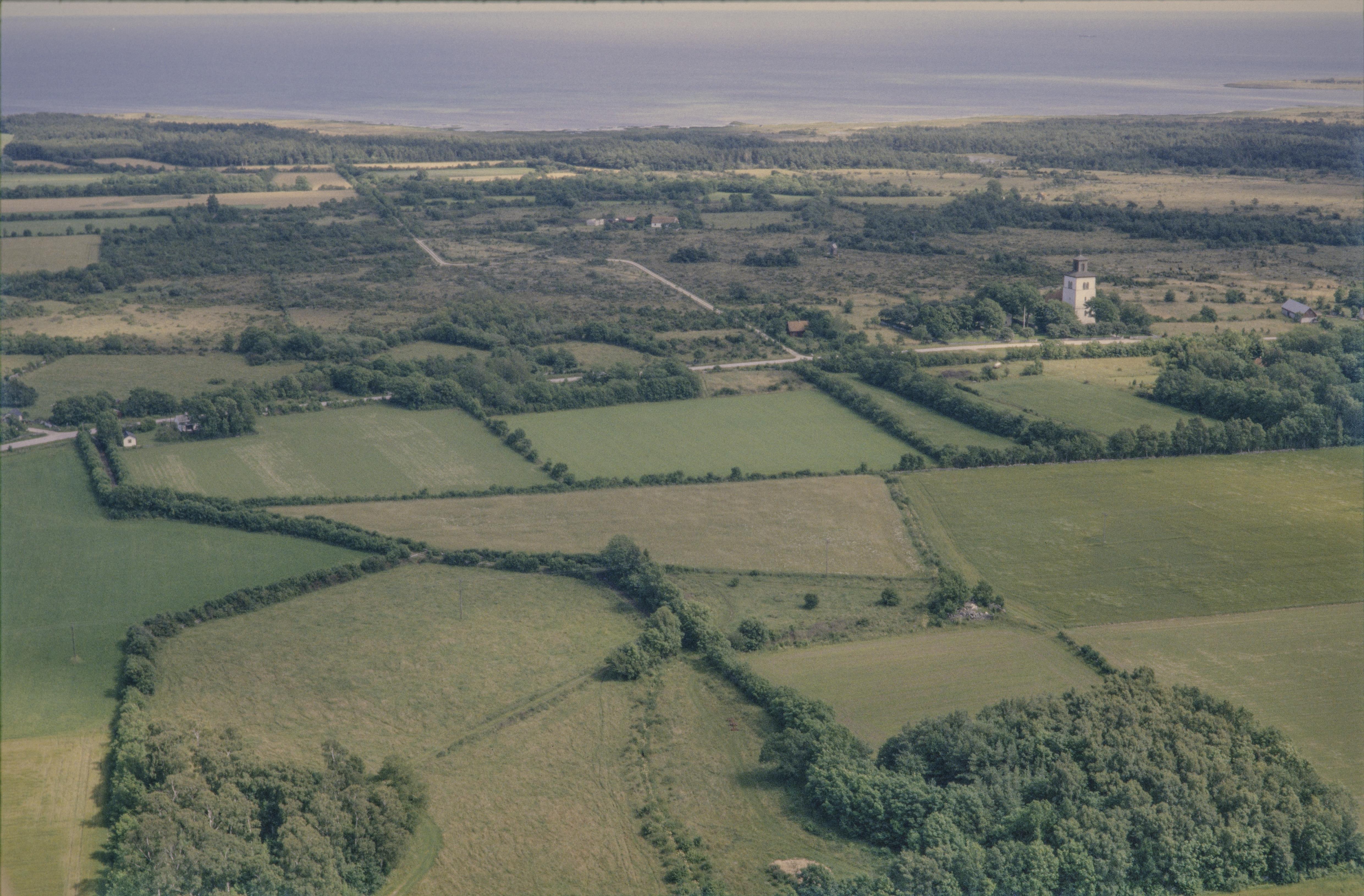 Beskrivning: Till höger över bildens mitt Fide kyrka och kyrkby. Vid kyrkan husgrund RAÄnr Fide 28:1. Bilden är tagen mot (väderstreck): OSO
