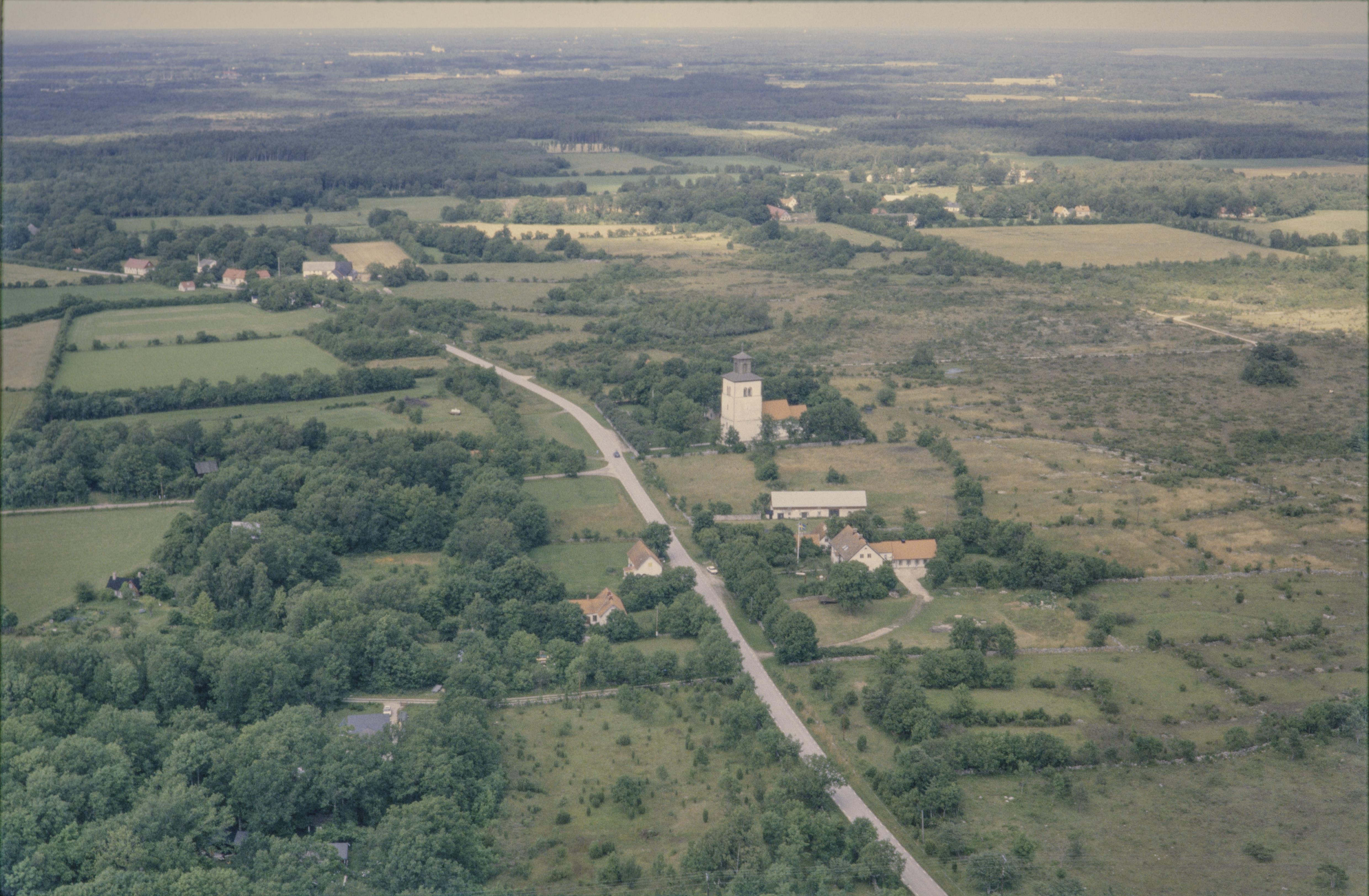 Beskrivning: Fide kyrka och kyrkby. Vid kyrkan husgrund RAÄnr Fide 28:1. Bilden är tagen mot (väderstreck): NNO