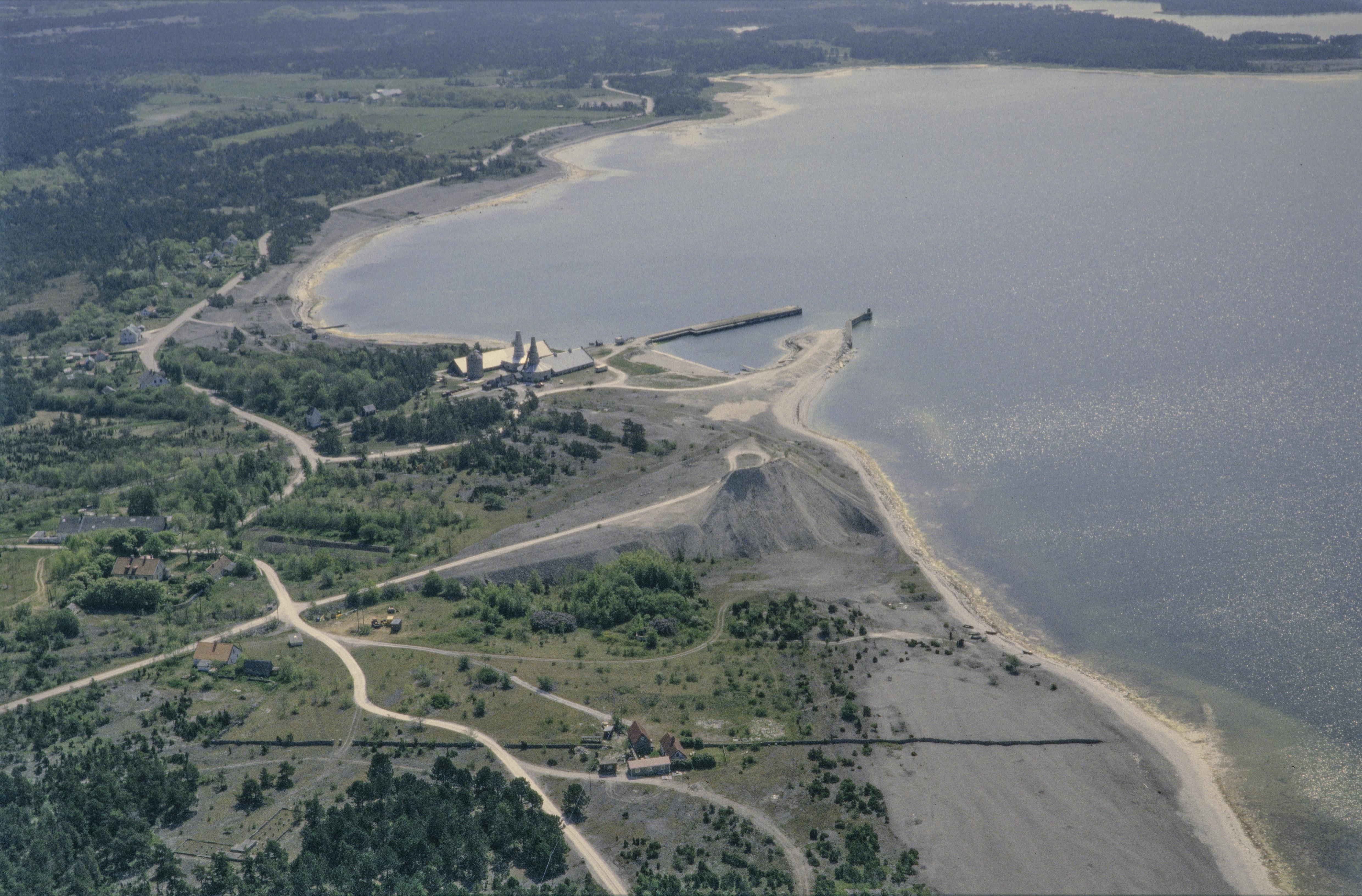 Beskrivning: Vid bildens mitt kalkugnar vid hamnen i Bläse fiskeläge och industriort vid Kappelshamnsviken. I området lämningar efter kalstensindustri; arbetarbostäder, järnväg, hamn RAÄnr Fleringe 94:6, stenbrott, kalkugnar, m.fl. Bilden är tagen mot (väderstreck): S