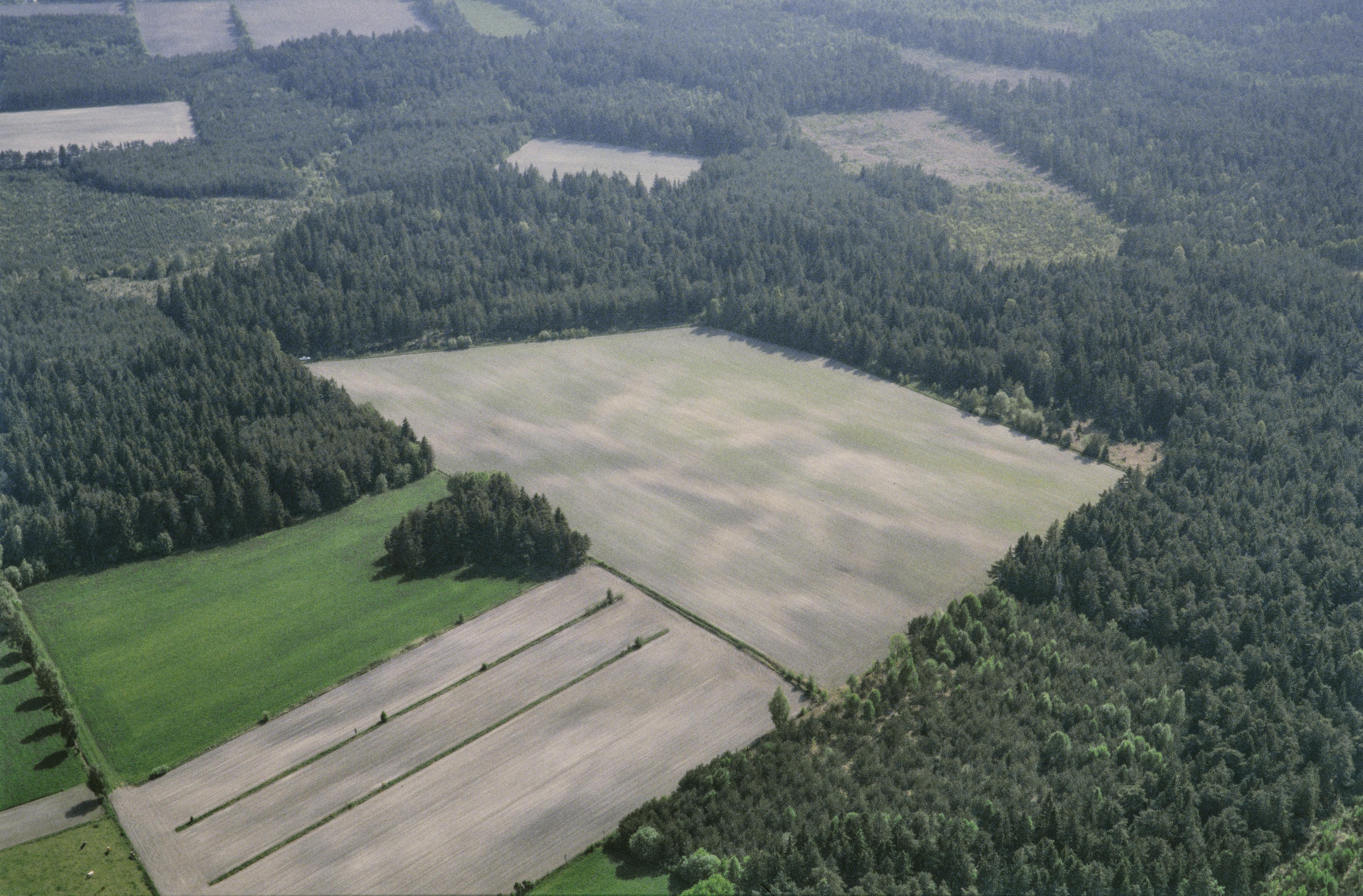 Beskrivning: Fossila åkrar och boplats RAÄnr Lau 106:1-6 m.fl. sydväst i Bönde by. Uppe till vänster området Husarve. Bilden är tagen mot (väderstreck): S