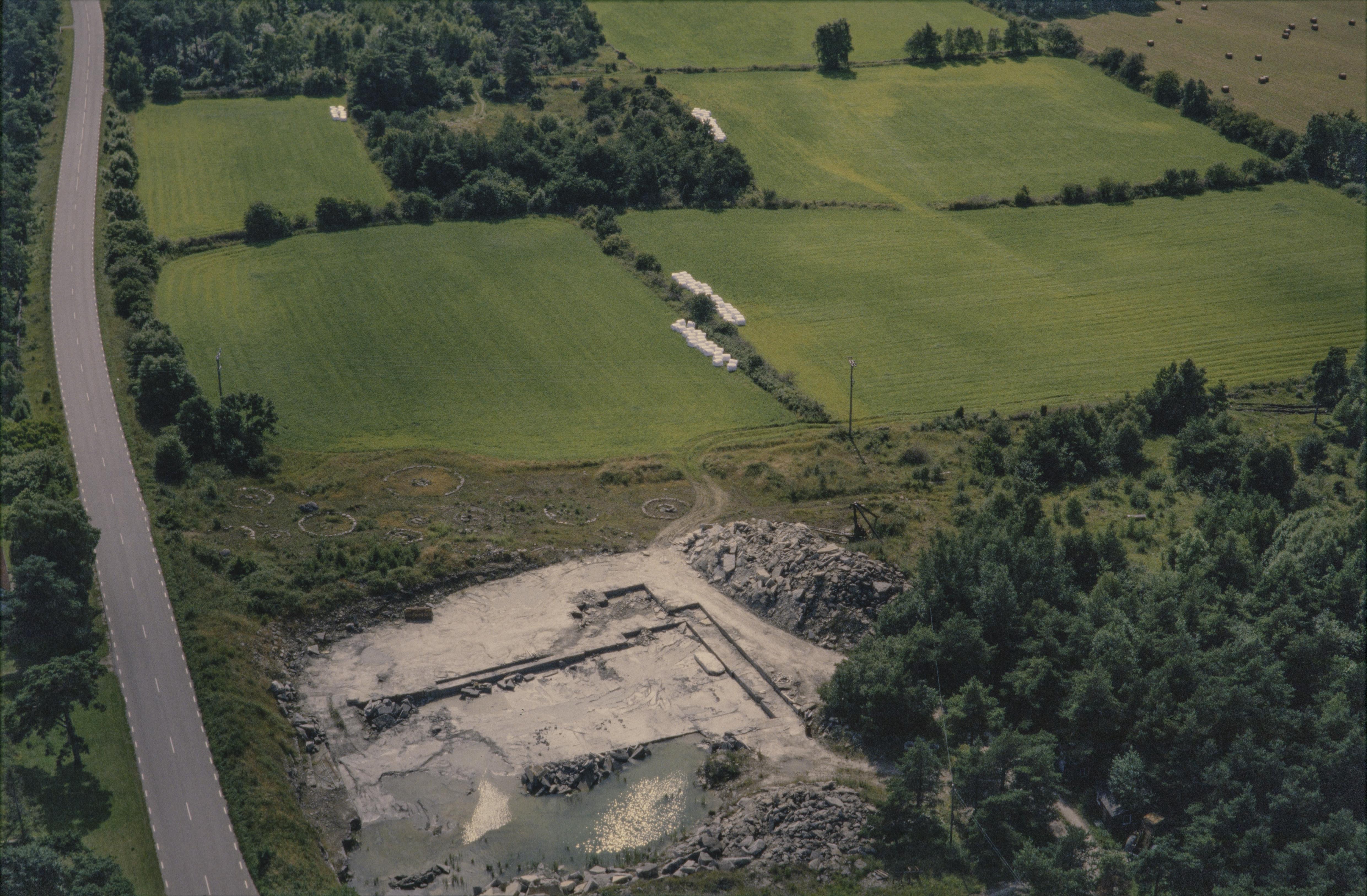 Beskrivning: Arkeologisk undersökning i gravfält RAÄnr Grötlingbo 1:1 i stenbrott i området Barshaldar på gränsen mellan socknen Grötlingbo (i bildens nedre del) och Fide (i bildens övre del). Bilden är tagen mot (väderstreck): SSV