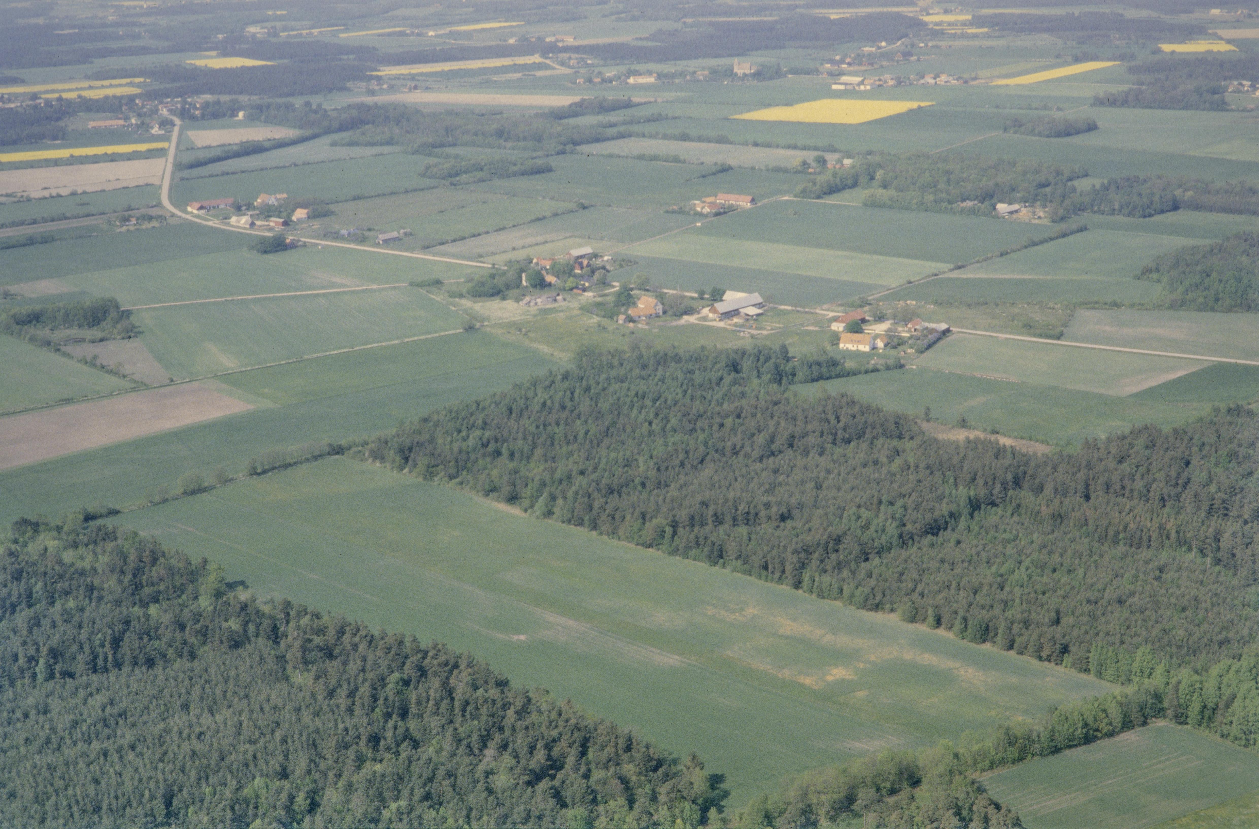 Beskrivning: I bildens nedre del fossil åker RAÄnr Hablingbo 136:1, hägnad Hablingbo 124:1, stenkrets Hablingbo 15:1 m.m. i området vid gårdarna Hemmungs och Medeby. Gränsen mot socknet Havdhem till höger i bildens nedre kant. Bilden är tagen mot (väderstreck): NO