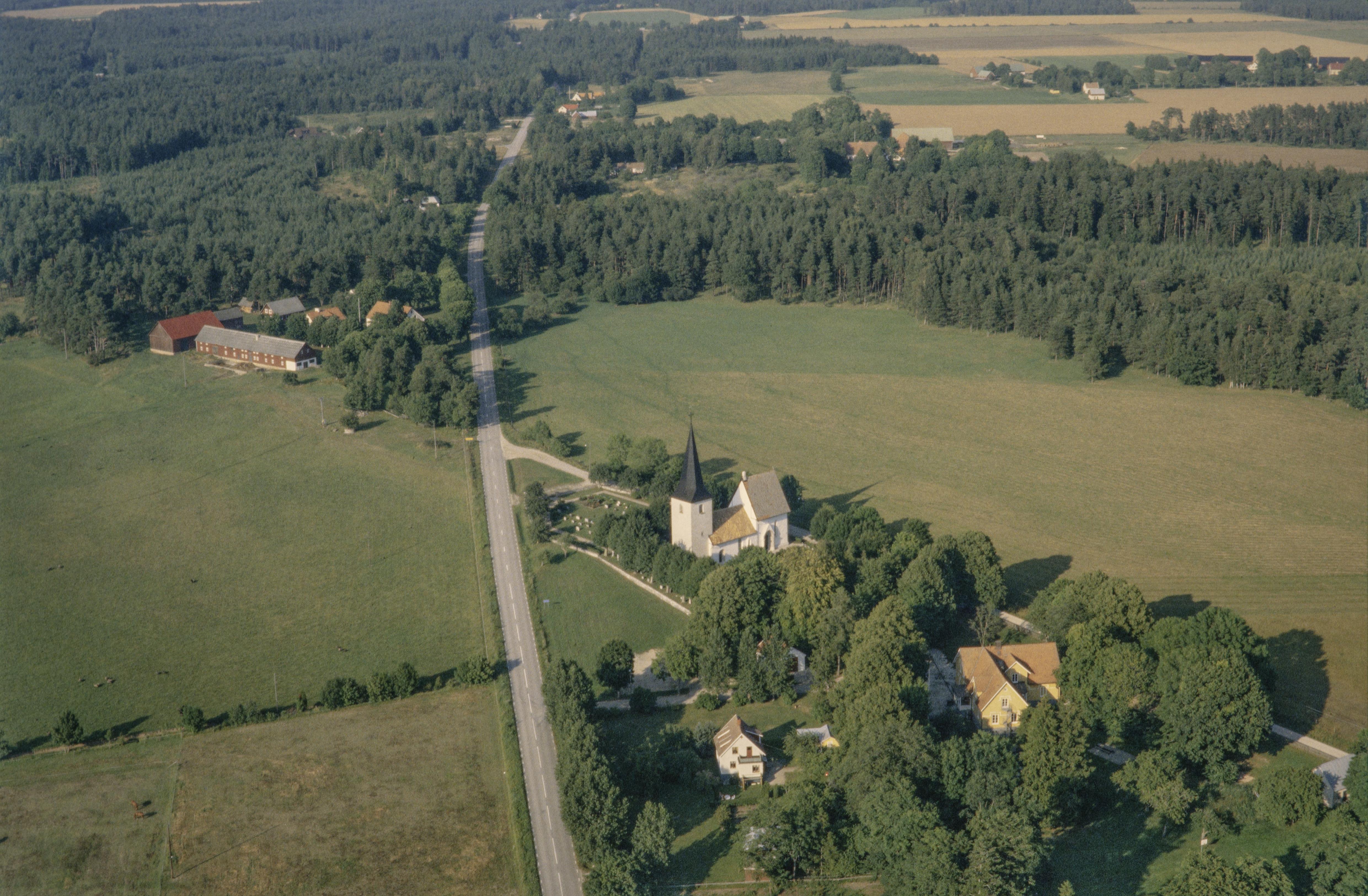 Beskrivning: Halla kyrkby. Halla kyrka vid bildens mitt. Vid kyrkan flatmarksgrav RAÄnr Halla 55:1. Bilden är tagen mot (väderstreck): NO