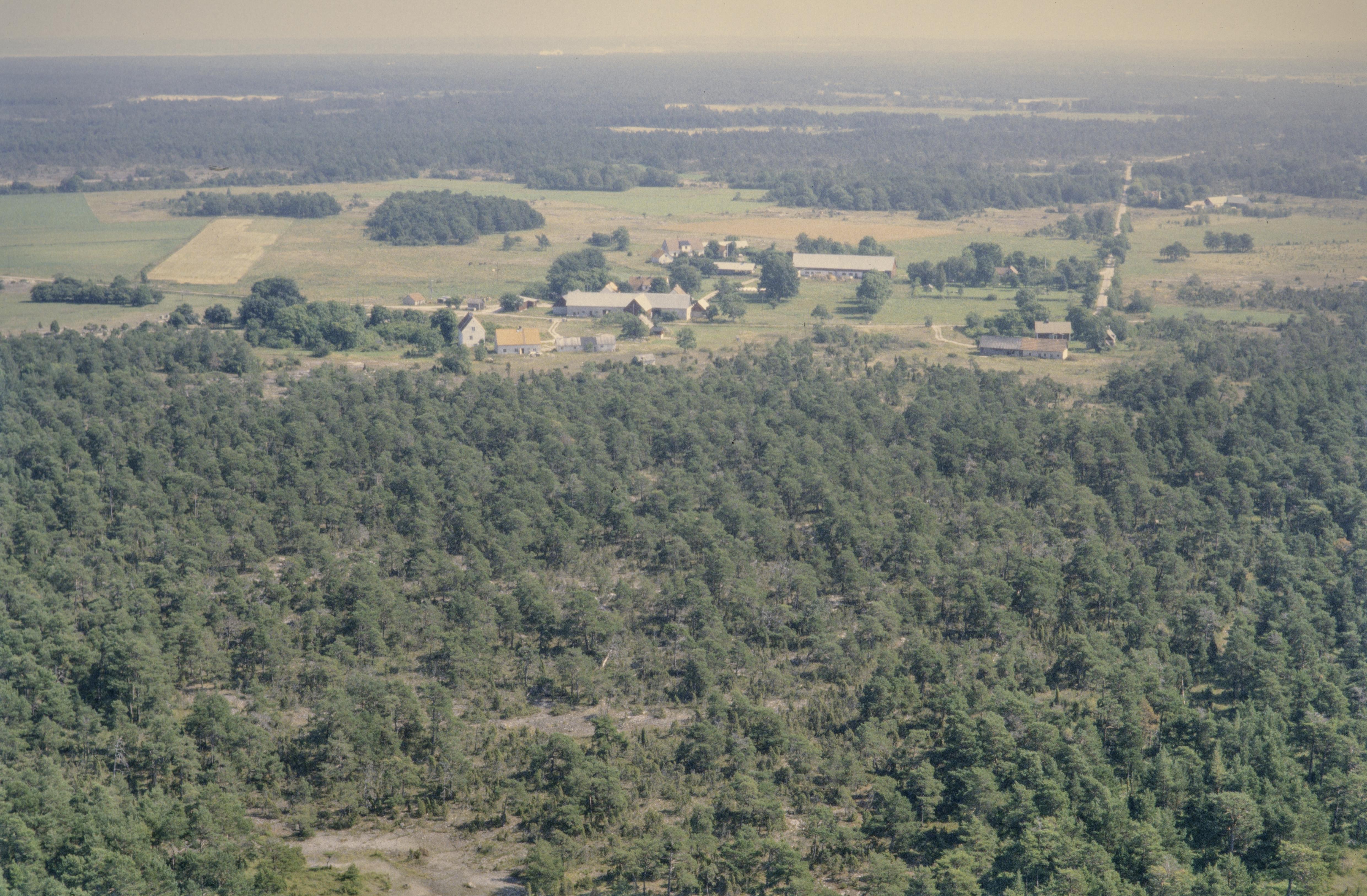 Beskrivning: Häftings by med gårdarna Lilla Häftings (till vänster) och Stora Häftings (till höger). I skogen i bildens nedre del lämningar efter kalkugnar RAÄnr Hangvar 220:1, 221:1 och tjärdal/tjärgrop Hangvar 222:1 m.fl. Bilden är tagen mot (väderstreck): SO