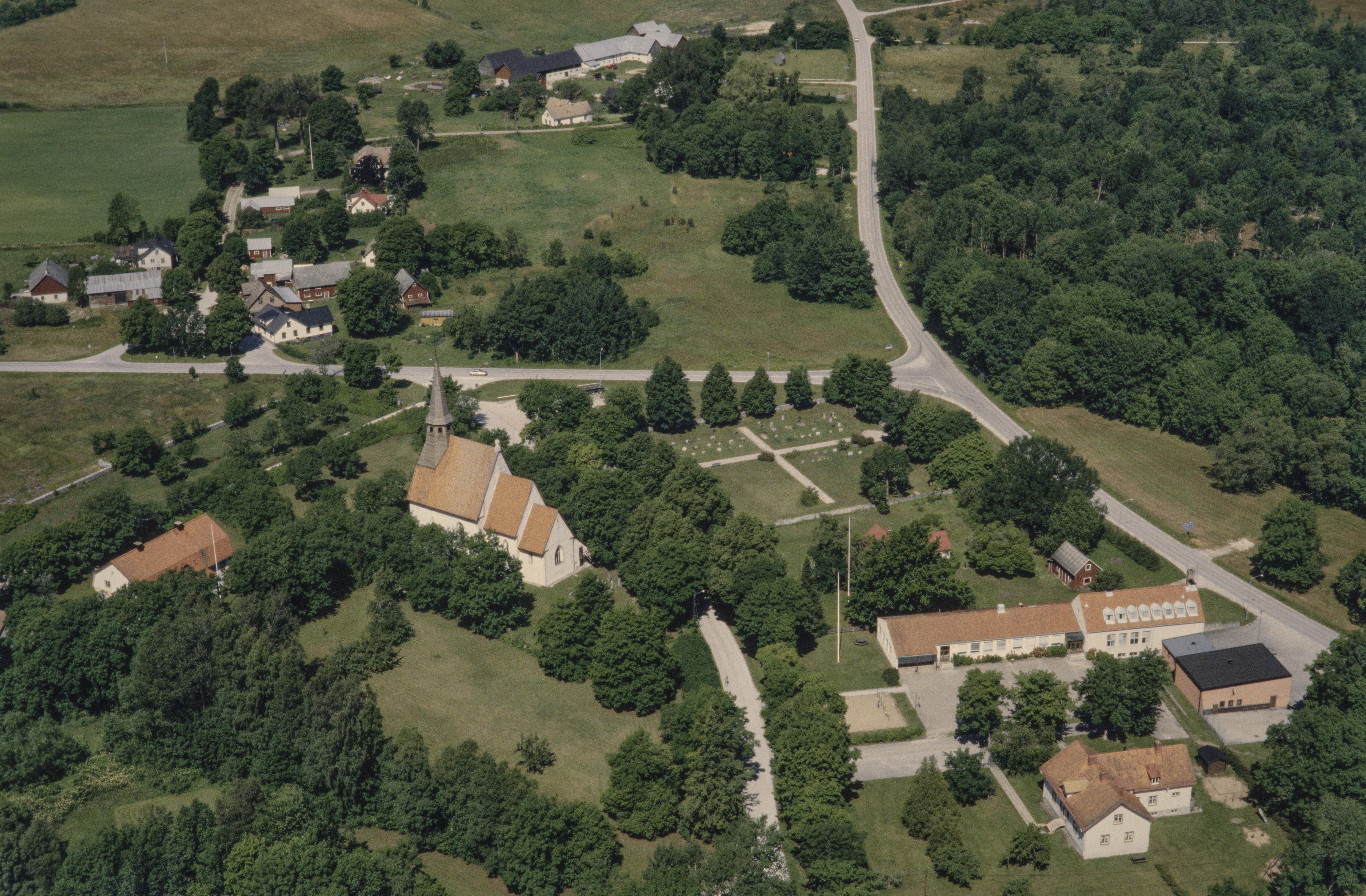 Beskrivning: Kräklingbo kyrkby. Kräklingbo kyrka till vänster om bildens mitt. Vid kyrkan kastalruin RAÄnr Kräklingbo 91:1. Bilden är tagen mot (väderstreck): NV