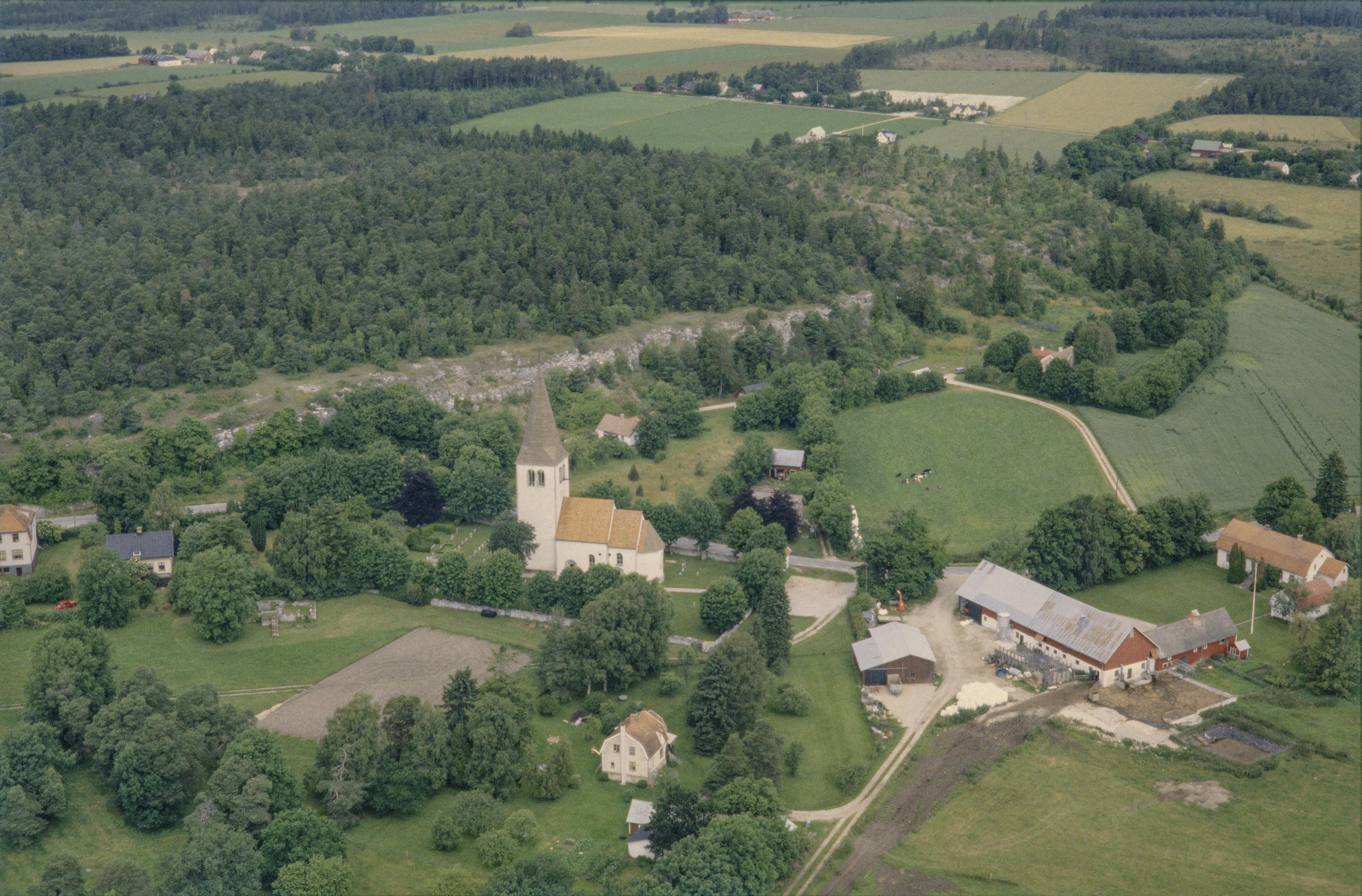 Beskrivning: Linde kyrka och kyrkby. På Lindeberget till vänster i bildens övre del fornborgarna RAÄnr Linde 6:1 (till vänster) och 5:1 (till höger). Bilden är tagen mot (väderstreck): NNV