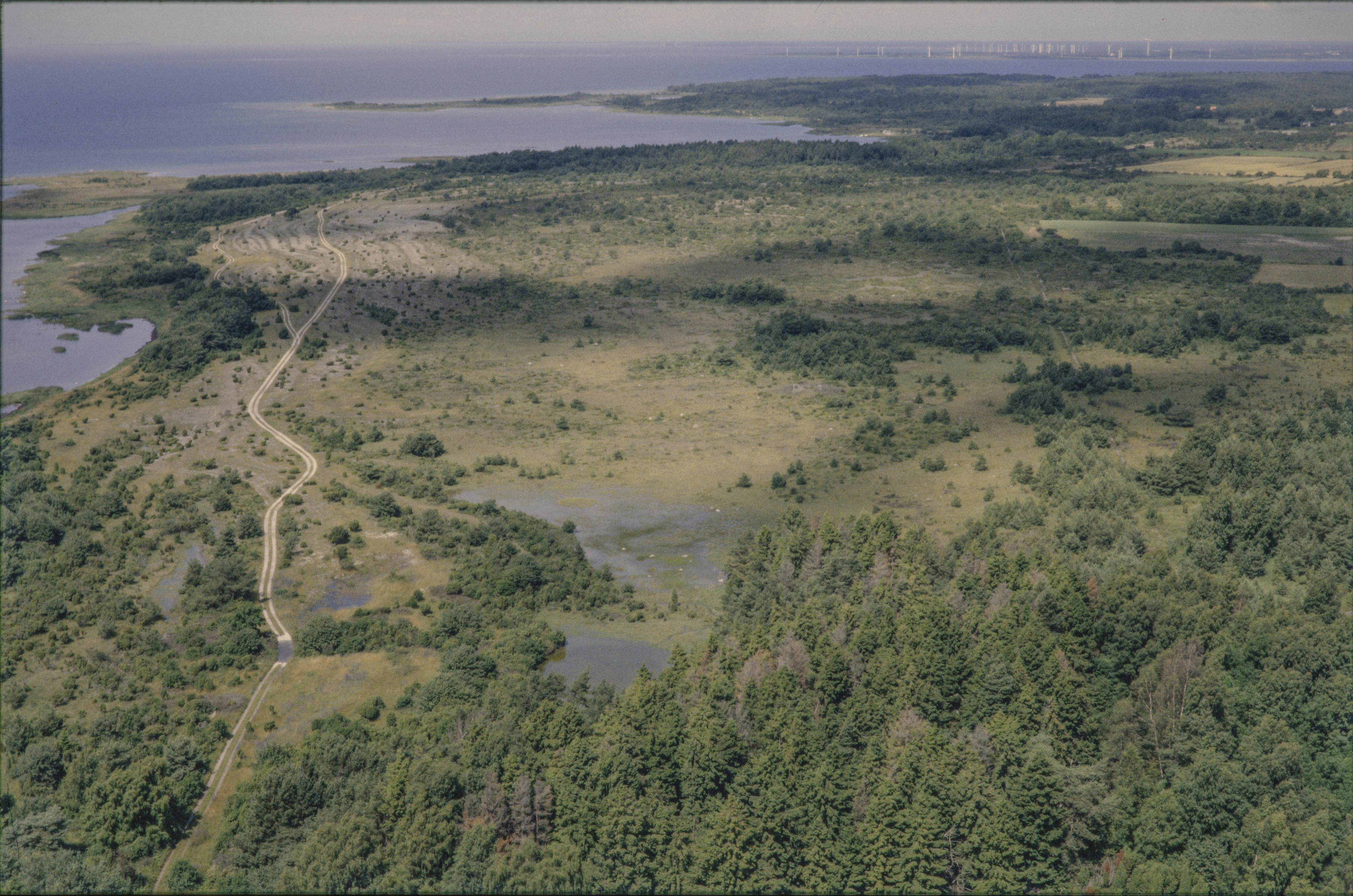 Beskrivning: Västlands-området vid Grumpe by söder om Västlands by. Vid bildens mitt område med stensättningar och grav RAÄnr Vamlingbo 122:1, 126:1, 128:1 m.fl. I bildens övre kant näset Killingholm vid viken Snäckvik mot Näsudden i Näs socken. Bilden är tagen mot (väderstreck): N