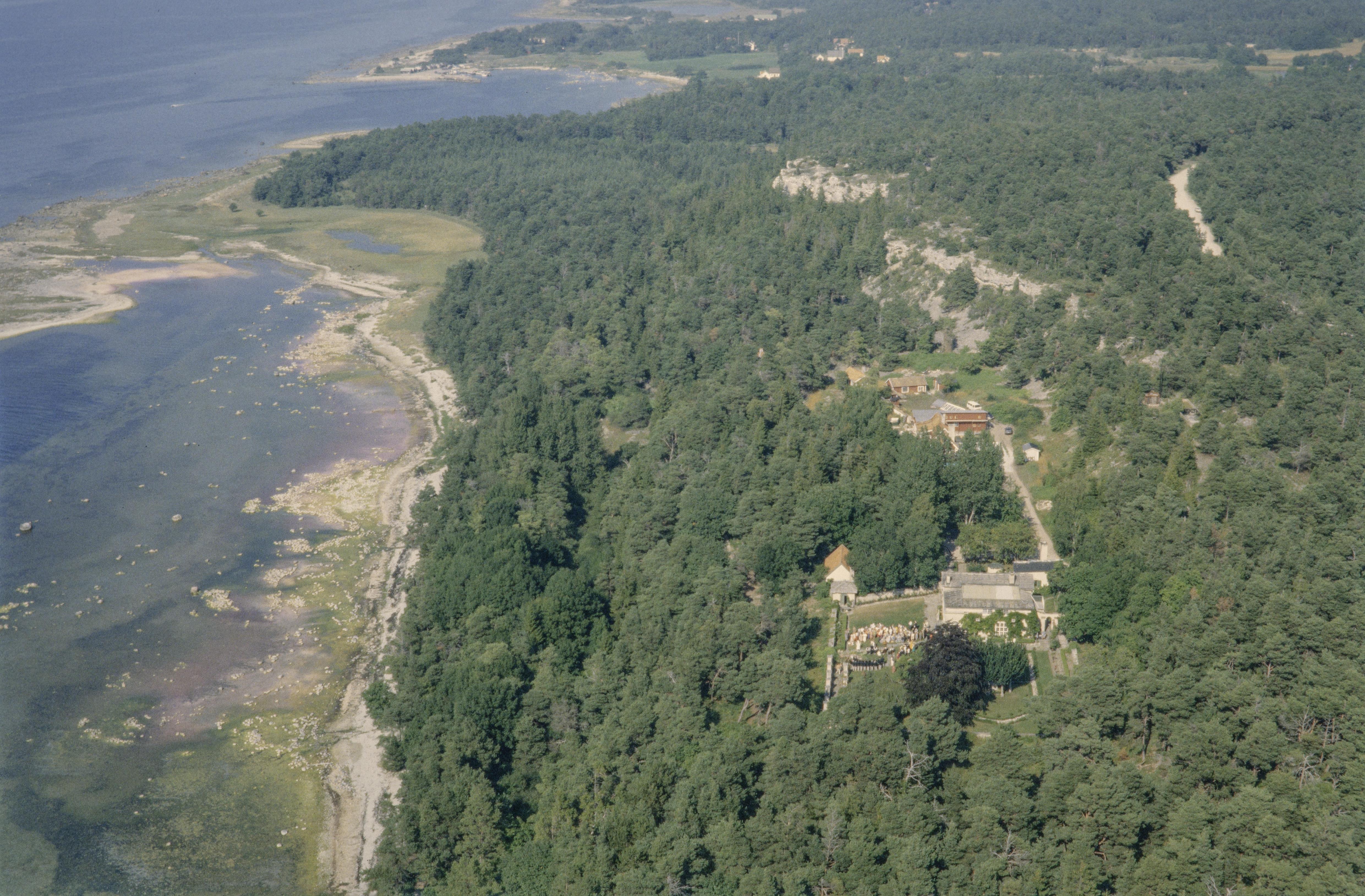 Beskrivning: Byggnadsminnet Villa Muramaris till höger om bildens mitt. Över bildens mitt stridsvärn RAÄnr Visby 184 och fornborg Visby 26:1 i Brucebo naturreservat. I bildens övre del gränsen mot socknet Väskinde. Fiskeläget Strandviken i bildens övre kant. Bilden är tagen mot (väderstreck): NNO