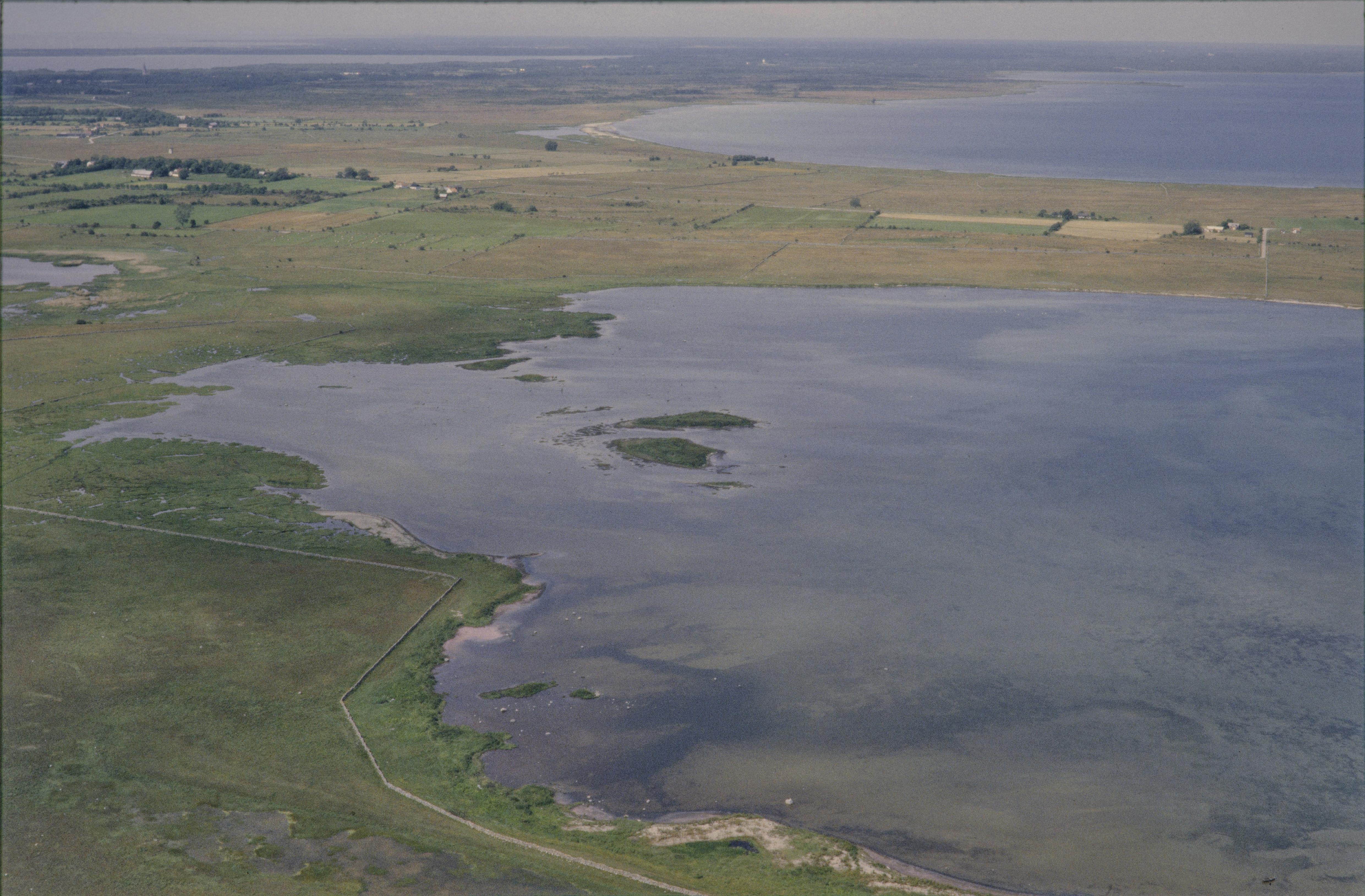 Beskrivning: I bildens nedre del Yttre Stockviken i Hamra socken. Vid bildens mitt gränsen mot Öja socken. Över bildens mitt Faludden. På udden område med ristade stenar (sliprännor) RAÄnr Öja 58:1-5 m.fl. Uppe till vänster gårdarna Ronnarve, Burge, Sigfride, Barkarve, Lasses m.fl. Öja kyrka till vänster och Fide kyrka till höger i bildens övre kant. Bilden är tagen mot (väderstreck): NNV