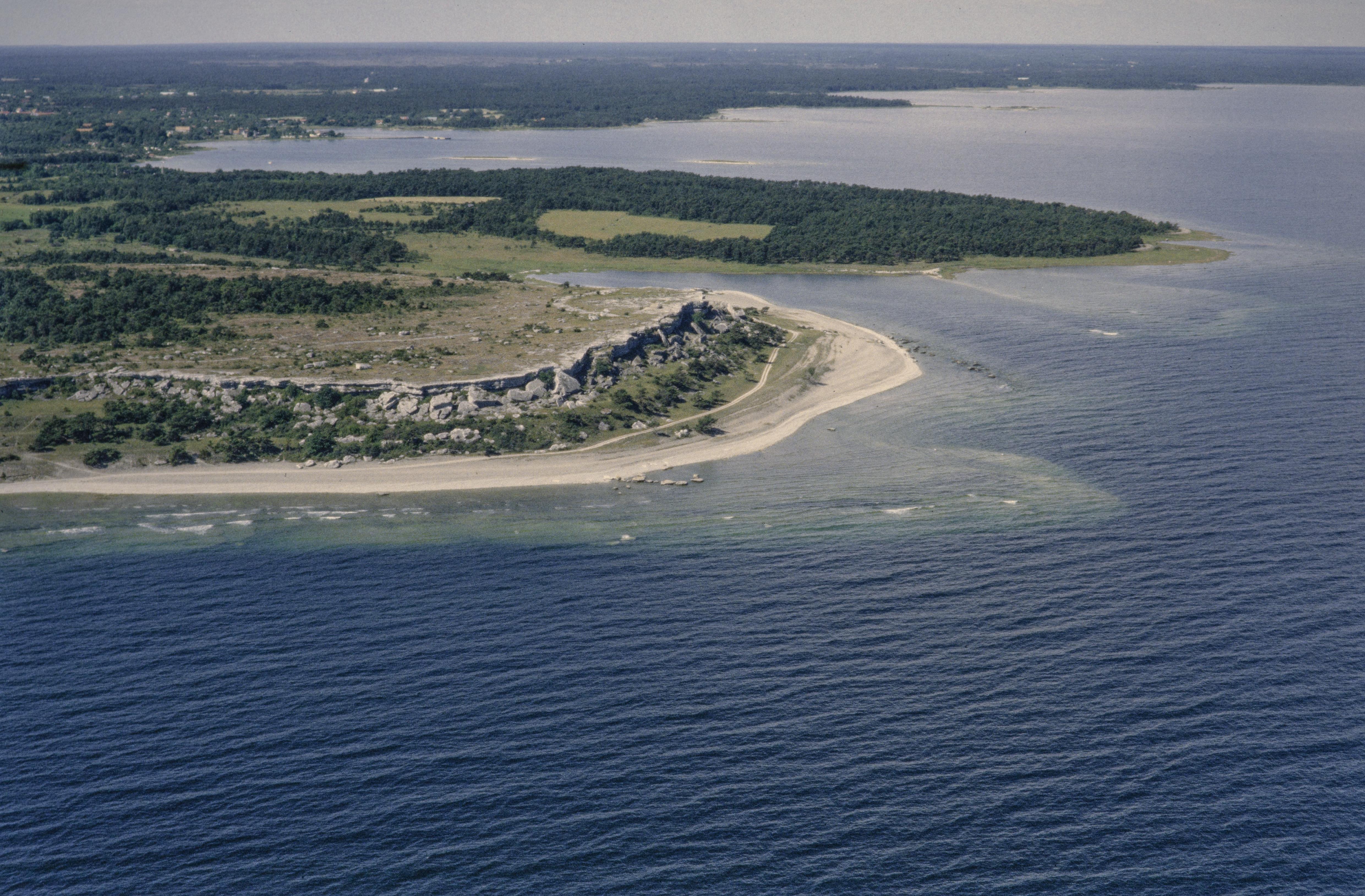 Beskrivning: Fornborgen Grogarnshuvud RAÄnr Östergarn 13:1 till vänster om bildens mitt. Bilden är tagen mot (väderstreck): VSV