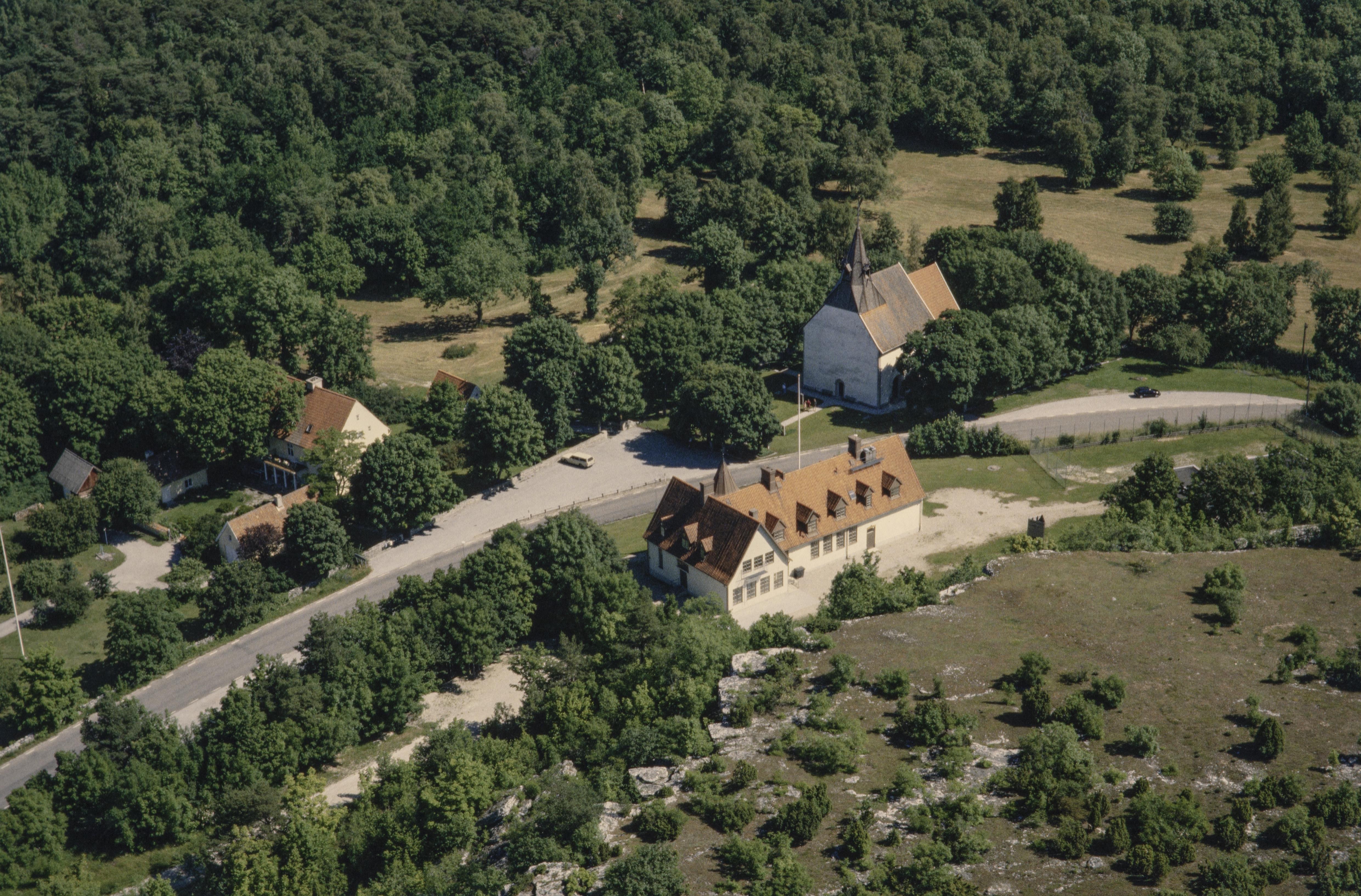 Beskrivning: Östergarns kyrkby. Östergarns kyrka uppe till höger och Östergarns skola under bildens mitt. En plats med tradition RAÄnr Östergarn 72:1 nere i bildens högra hörn. Bilden är tagen mot (väderstreck): NO