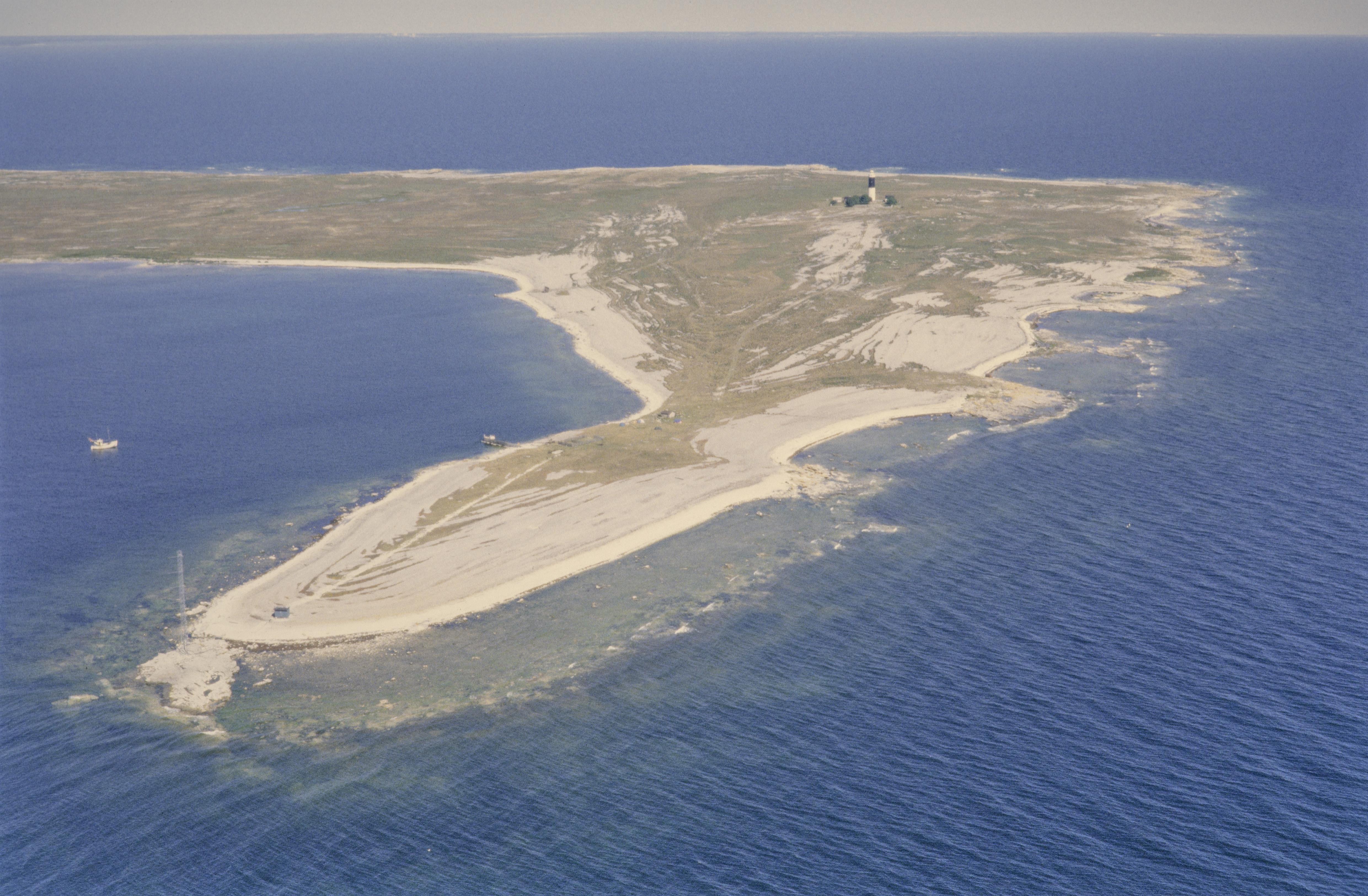Beskrivning: Ön Östergarnsholm. På ön finns fyra fyrar, två är gamla och inte i bruk. Över bildens mitt Östergarns nya fyr (de andra tre syns inte i bilden). Vid fyren röse och stensättningar RAÄnr Östergarn 21:1, 25:1, 104:1 m.fl. Bilden är tagen mot (väderstreck): NNV