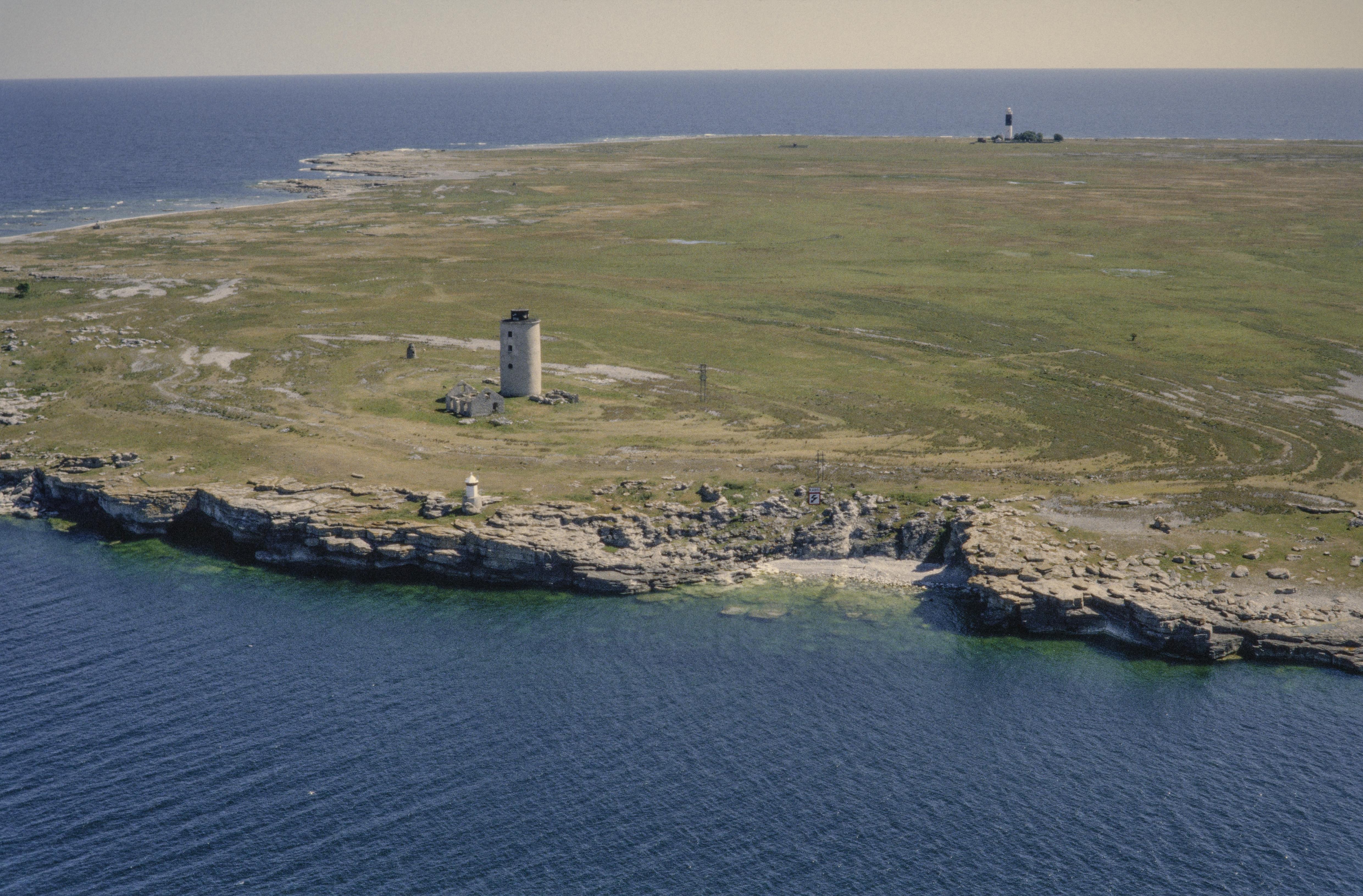 Beskrivning: Ön Östergarnsholm har fyra fyrar (alla syns i bilden). Vid bildens mitt Östergarns gamla fyr med provisoriska stenkolsfyren, båda från 1800-talet. Dessa två är byggnadsminnen. De andra två (en i bildens nedre del och en i övre) är byggda på 1900-talet. Gamla fyrplatsen RAÄnr Östergarn 103:1 är byggd i fornborg RAÄnr Östergarn 20:1. Bilden är tagen mot (väderstreck): ONO