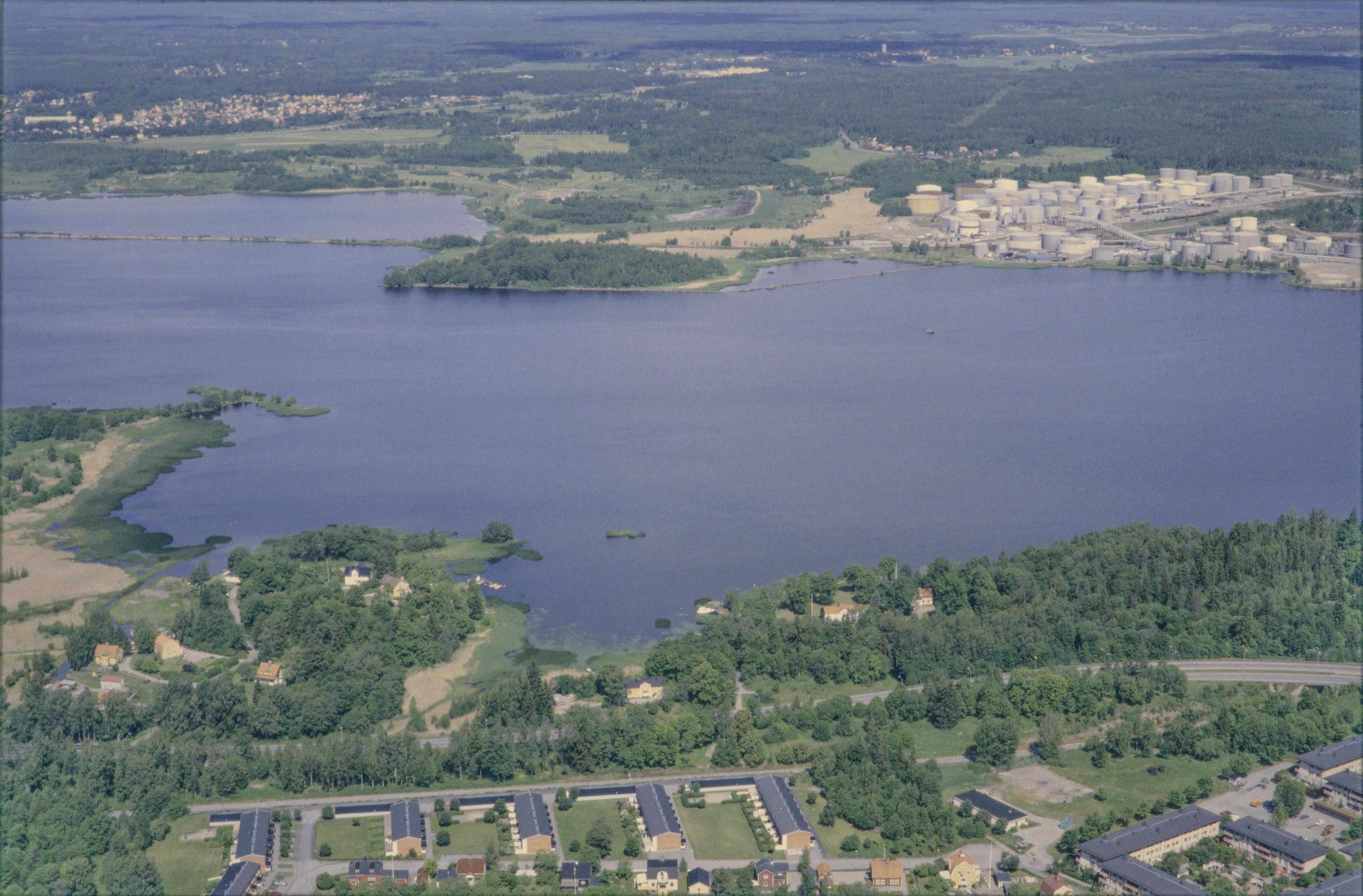 Beskrivning: Gävle tätort vid havsviken Inre fjärden. I bildens nedre del vägarna Österbågen och Nybergsallén söder om områdena Källö och Bomhus i tätortens östra del. Nere till vänster och vid bildens mitt T-uddens naturreservat med fäbodslämning RAÄnr Gävle 208:1. I bildens övre del området Källhagen m.m. Bilden är tagen mot (väderstreck): NV