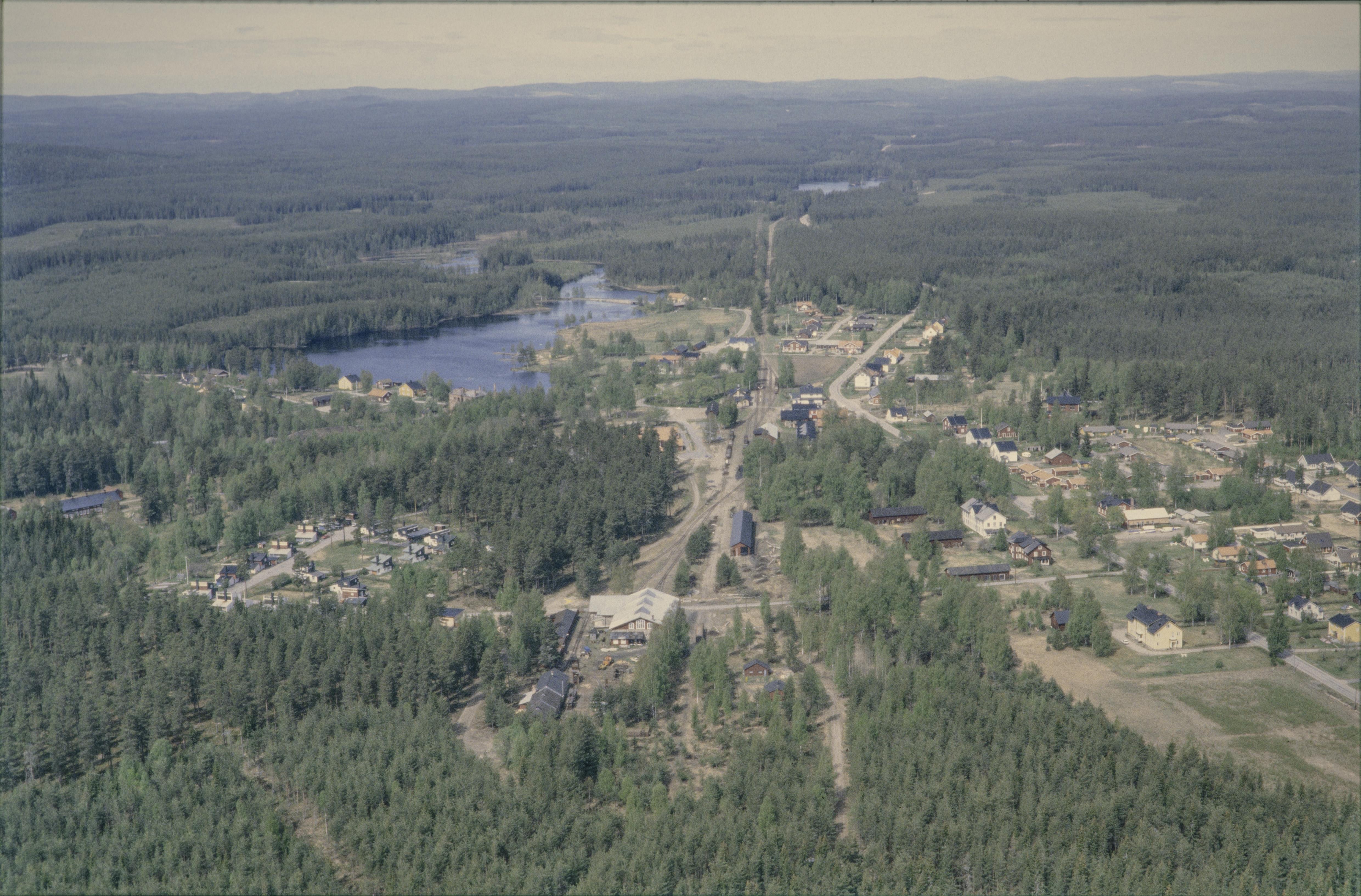 Beskrivning: Jädraås bruk vid Jädraån. Bruksherrgård, hytta, smedja, järnvägsstation m.m. Till vänster över bildens mitt ett område med fångstgropar RAÄnr Ockelbo 253:1, m.fl. Bilden är tagen mot (väderstreck): NV