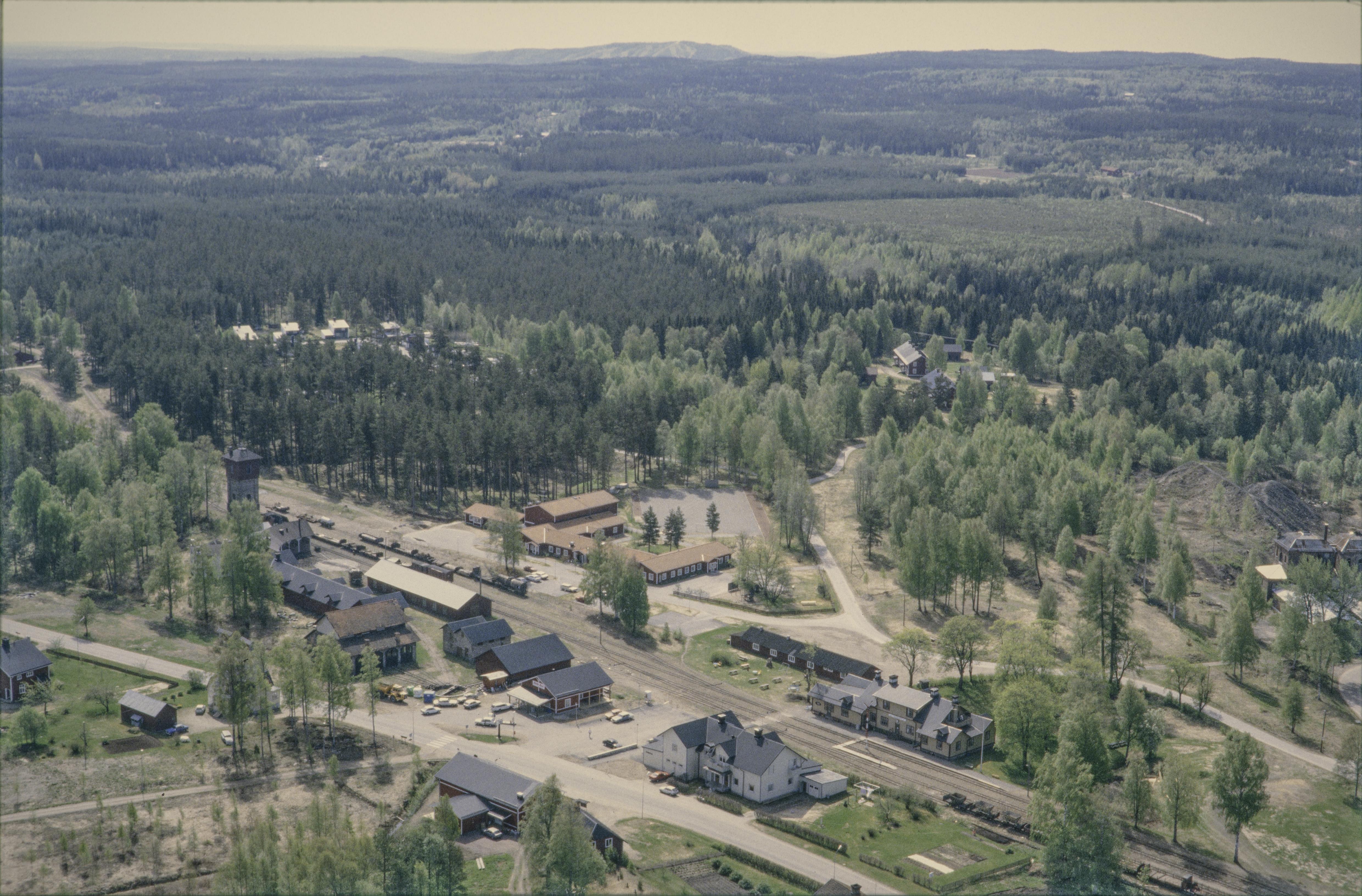 Beskrivning: Jädraås bruk vid Jädraån. Bruksherrgård, hytta, smedja, järnvägsstation (nere till höger) m.m. Bilden är tagen mot (väderstreck): S