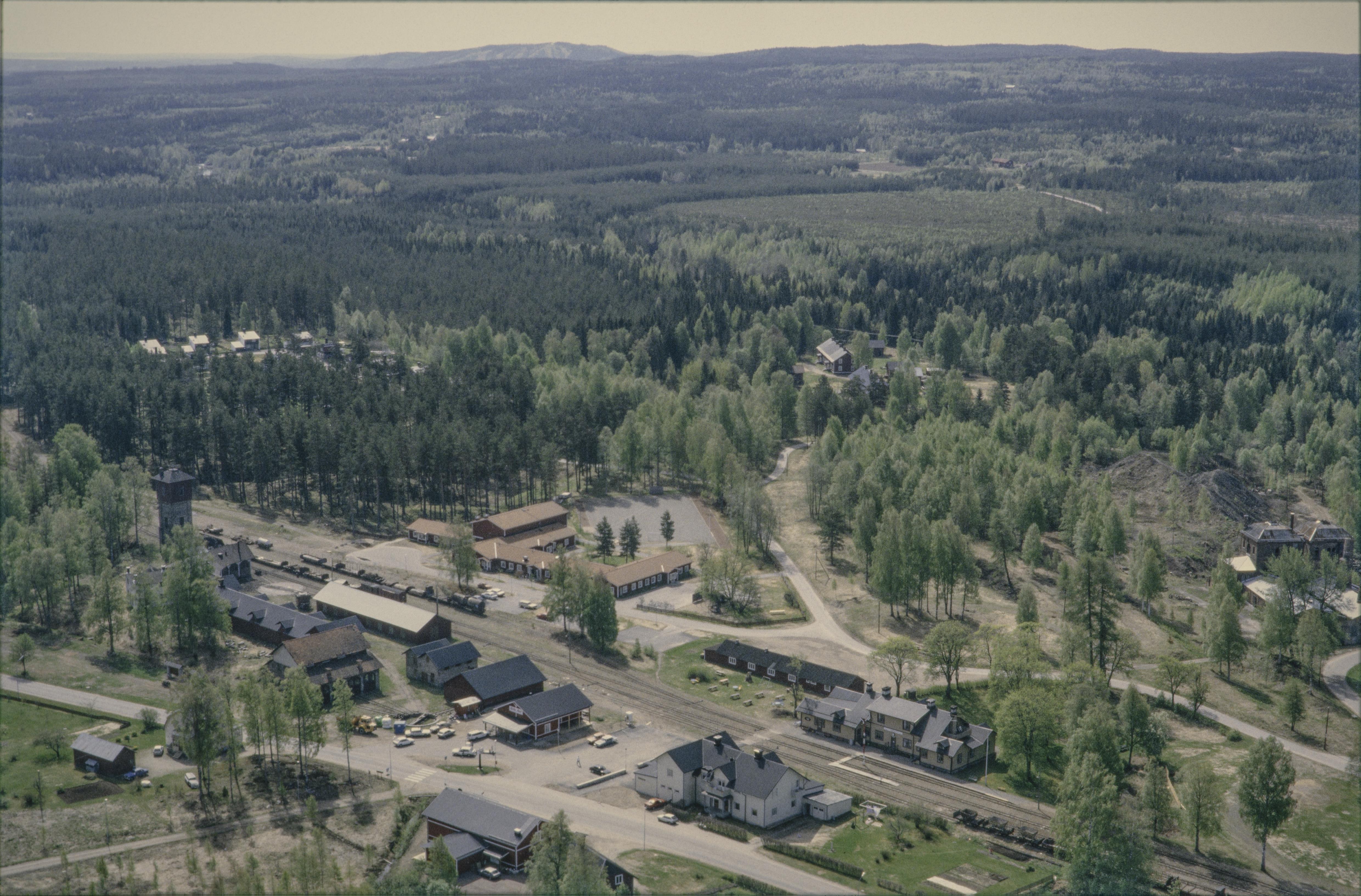 Beskrivning: Jädraås bruk vid Jädraån. Bruksherrgård, hytta, smedja, järnvägsstation (nere till höger) m.m. Bilden är tagen mot (väderstreck): S