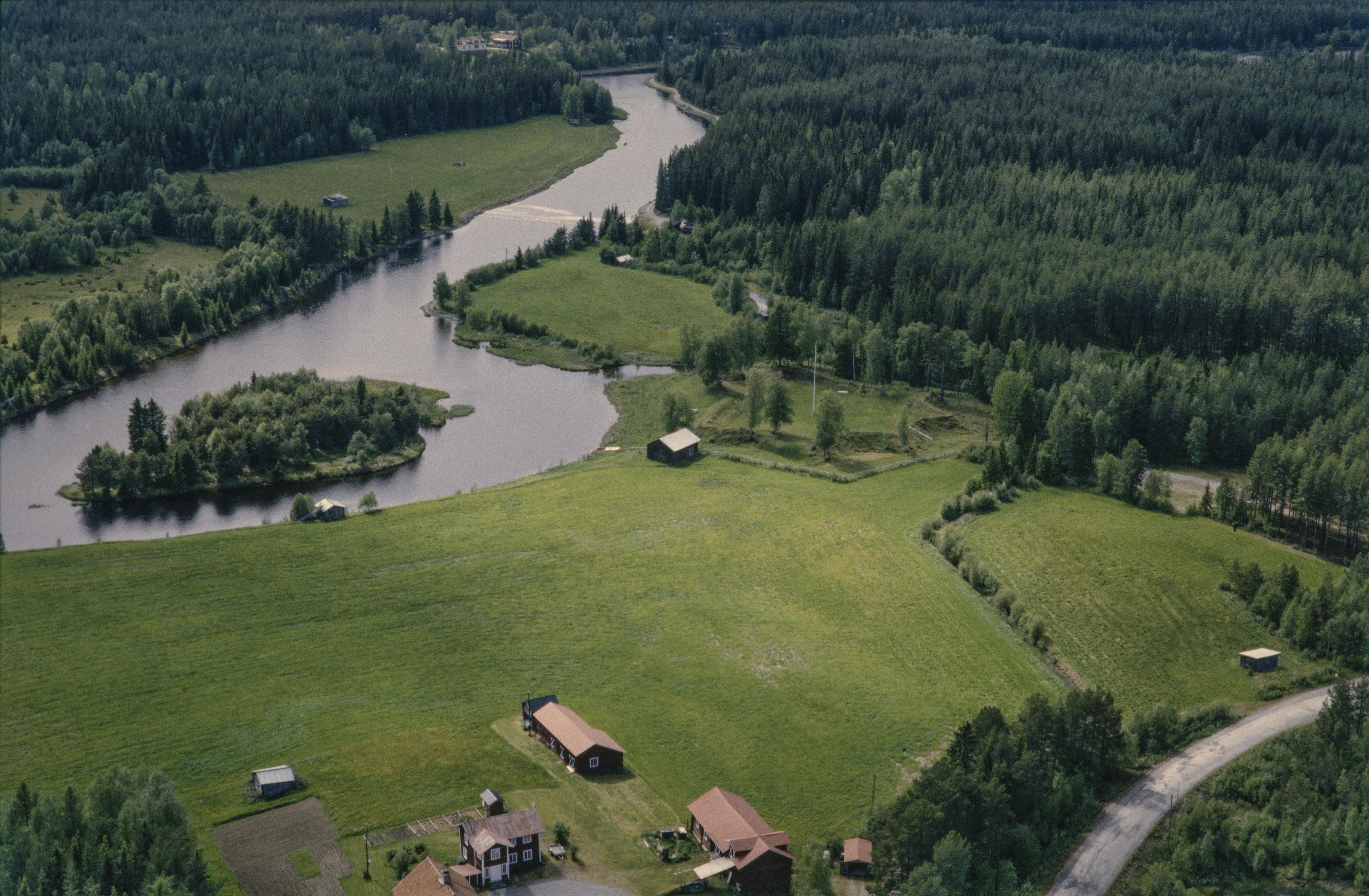 Beskrivning: Älven Ljusnan nordväst i Långå by. Till höger över bildens mitt Långå skans med minnesmärke RAÄnr Hede 6:1-3. Bilden är tagen mot (väderstreck): SV