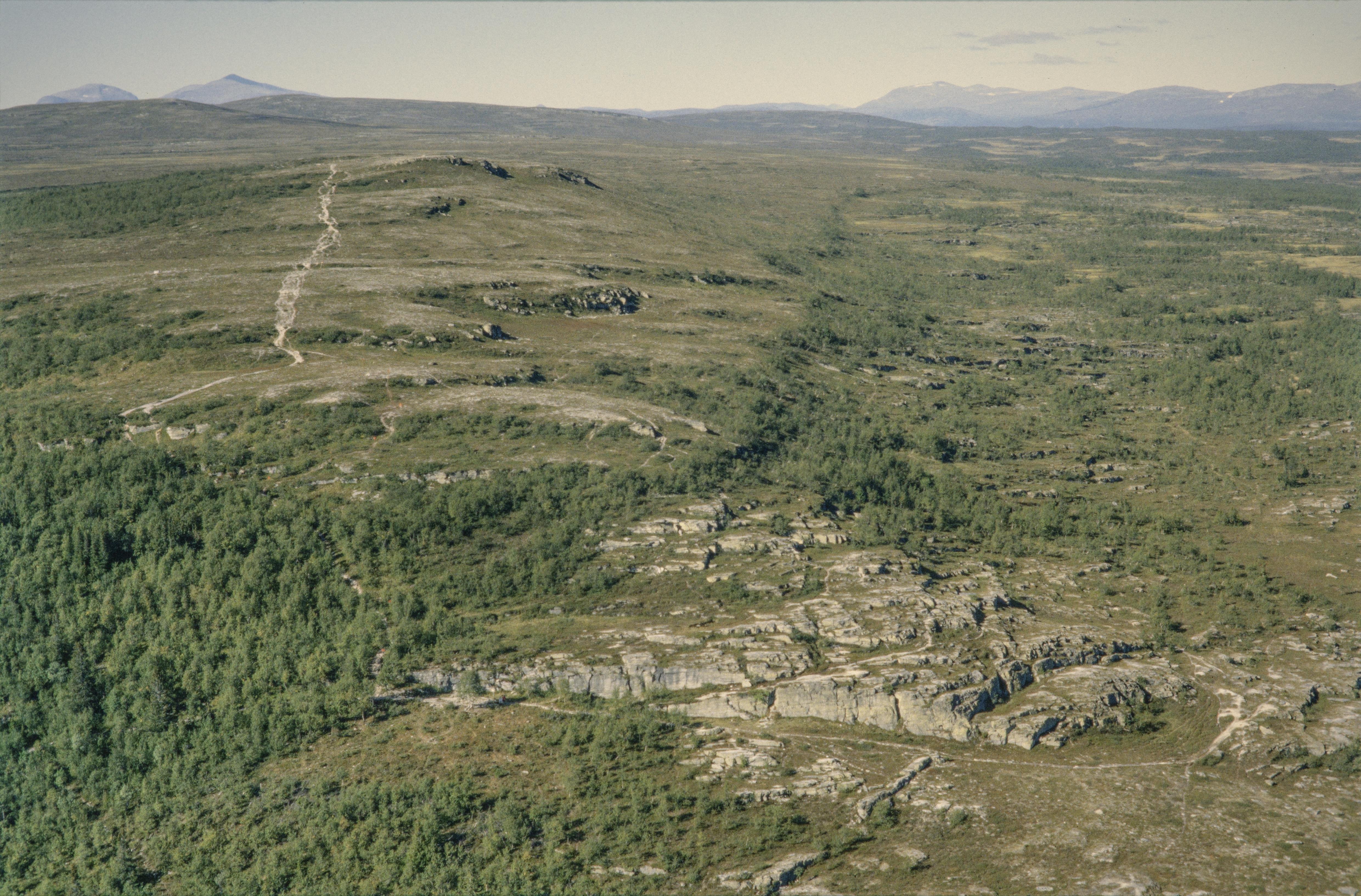 Beskrivning: Östra delen av lågfjället Flatruet (Fleete) vid bergstoppen Ruändan (Sjnjaptjegietije). I bergsidan under bildens mitt en lodrätt klippvägg med hällmålningar RAÄnr Tännäs 58:1. Bilden är tagen mot (väderstreck): NV