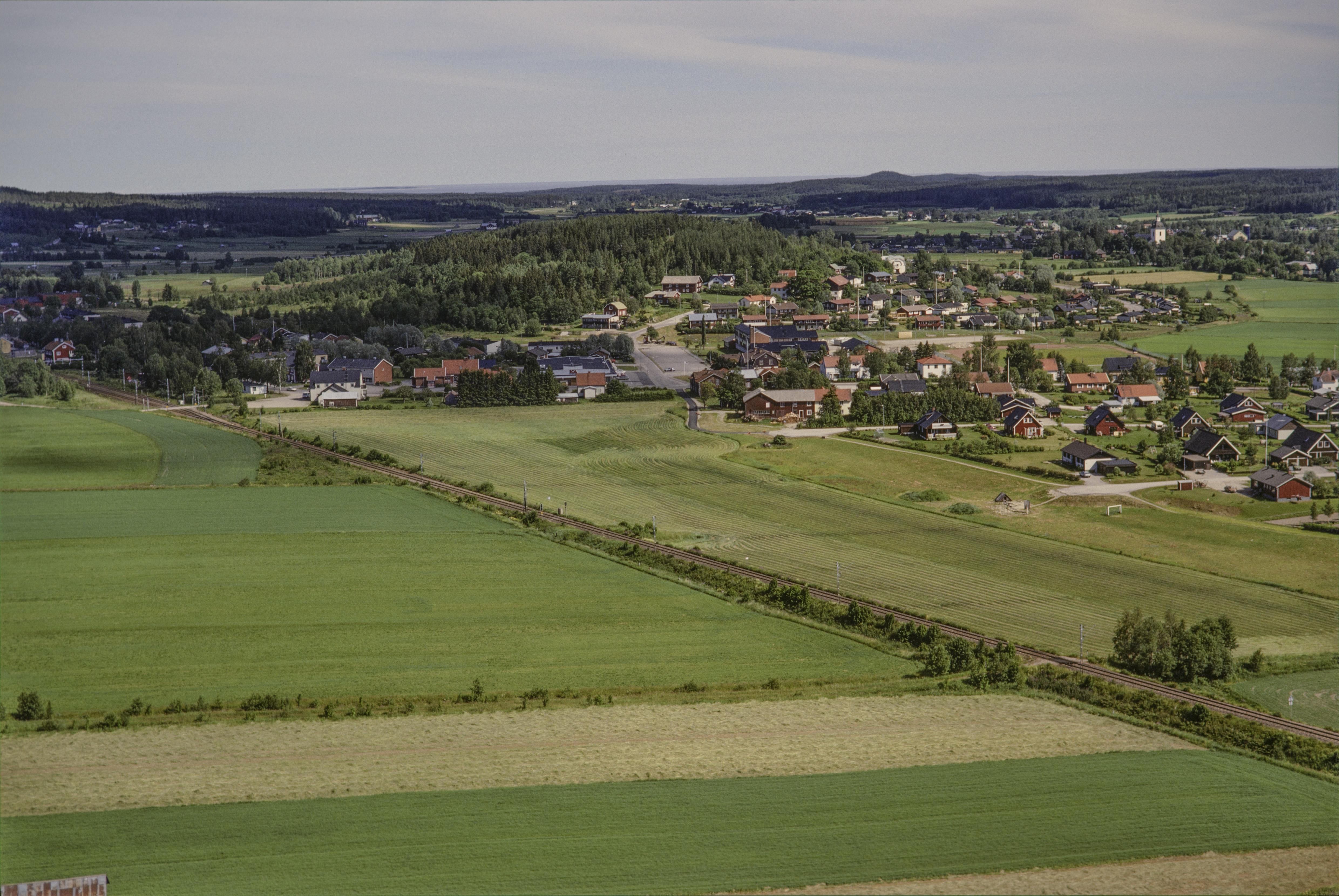 Beskrivning: Gnarpsåns dalgång vid området Bosta. I bildens övre del Gnarps tätort och kyrkby. Gnarps kyrka uppe till höger. Över bildens mitt området Vallen med fyndplats RAÄnr Gnarp 156:1. Järnvägsspår (från bildens vänstra kant ner mot höger) i östra delen av Gnarps tätort. Bilden är tagen mot (väderstreck): OSO