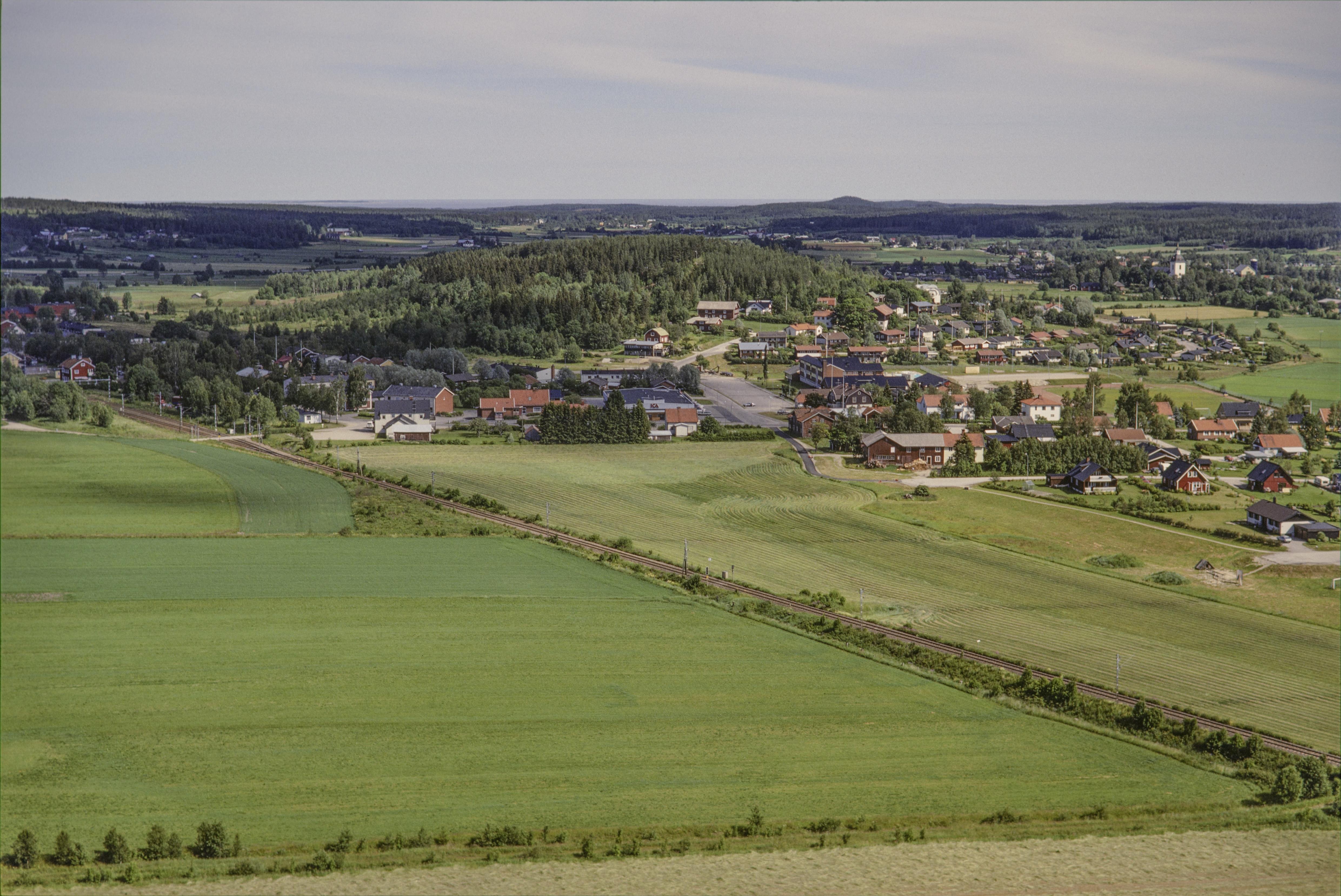 Beskrivning: Gnarpsåns dalgång vid området Bosta. I bildens övre del Gnarps tätort och kyrkby. Gnarps kyrka uppe till höger. Över bildens mitt området Vallen med fyndplats RAÄnr Gnarp 156:1. Järnvägsspår (från bildens vänstra kant ner mot höger). Bilden är tagen mot (väderstreck): OSO
