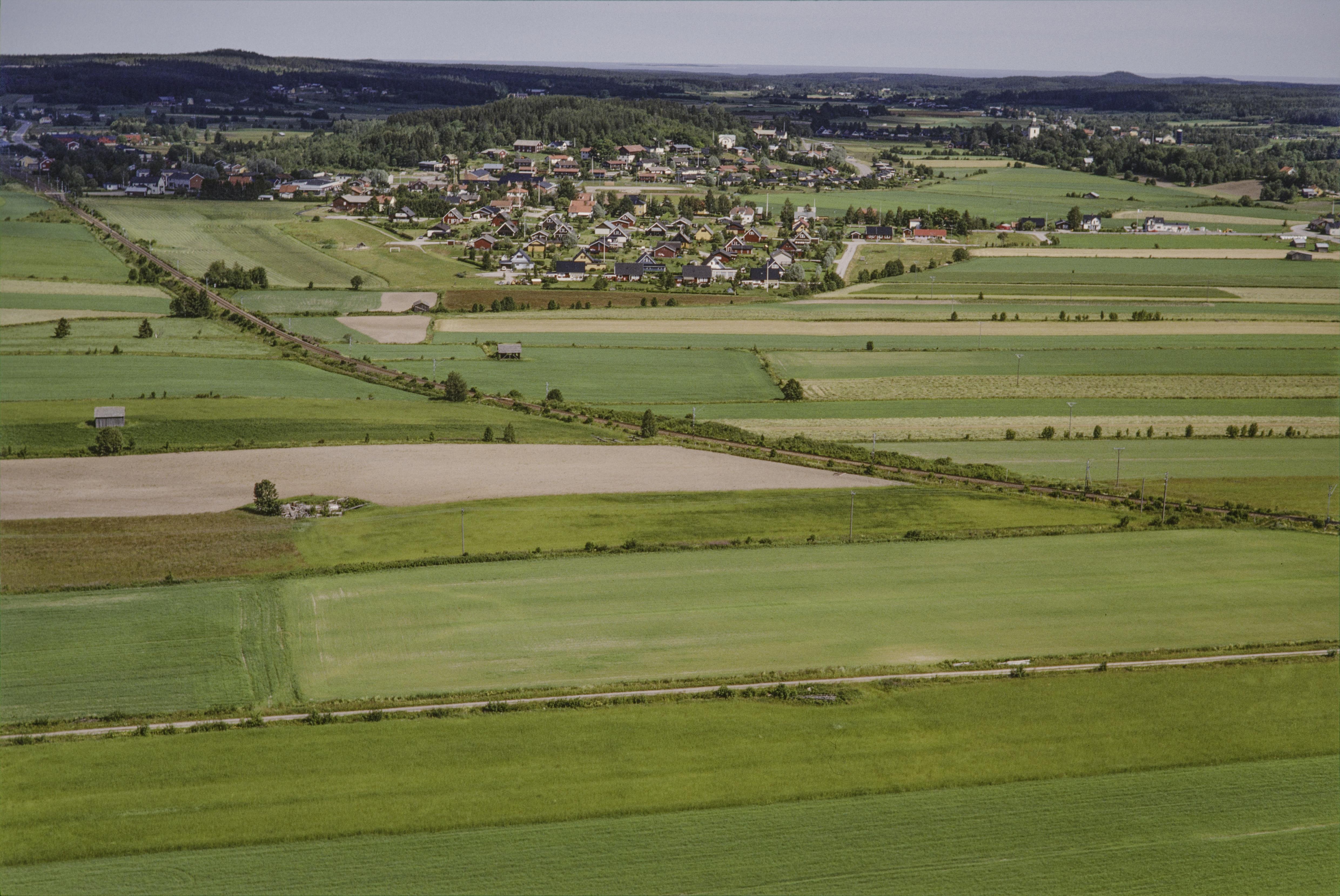 Beskrivning: Gnarpsåns dalgång vid området Bosta. I bildens övre del Gnarps tätort och kyrkby. Gnarps kyrka uppe till höger. Över bildens mitt området Vallen med fyndplats RAÄnr Gnarp 156:1. Järnvägsspår (från bildens vänstra kant ner mot höger). Bilden är tagen mot (väderstreck): OSO