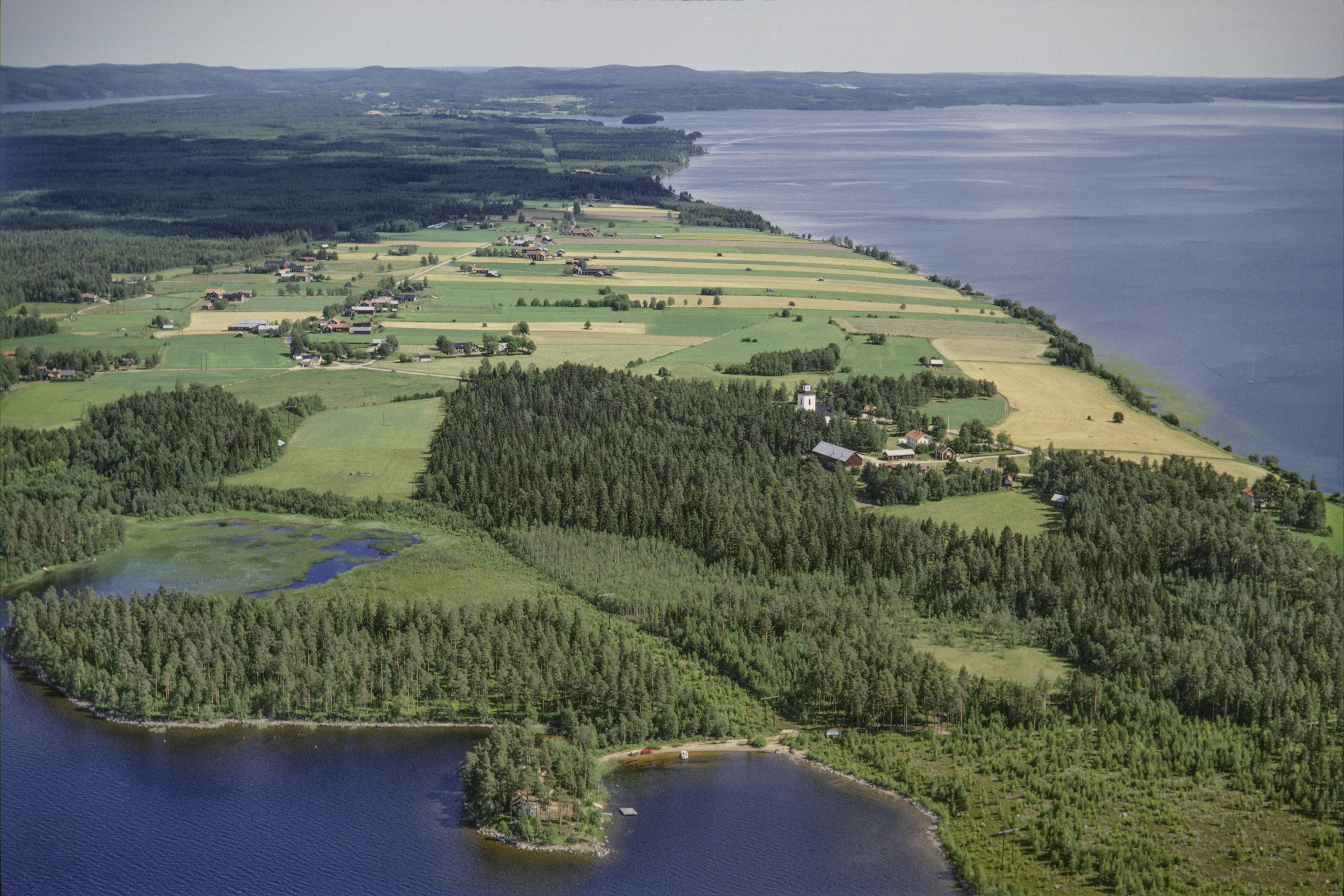 Beskrivning: Norrbo kyrkby på näset vid sundet mellan sjöarna Norrdellen (nere till vänster) och Sördellen (skrivs även Norra Dellen och Södra Dellen). Norrbo kyrka till höger under bildens mitt. Vid kyrkan gravfält RAÄnr Norrbo 21:1. Bilden är tagen mot (väderstreck): SO