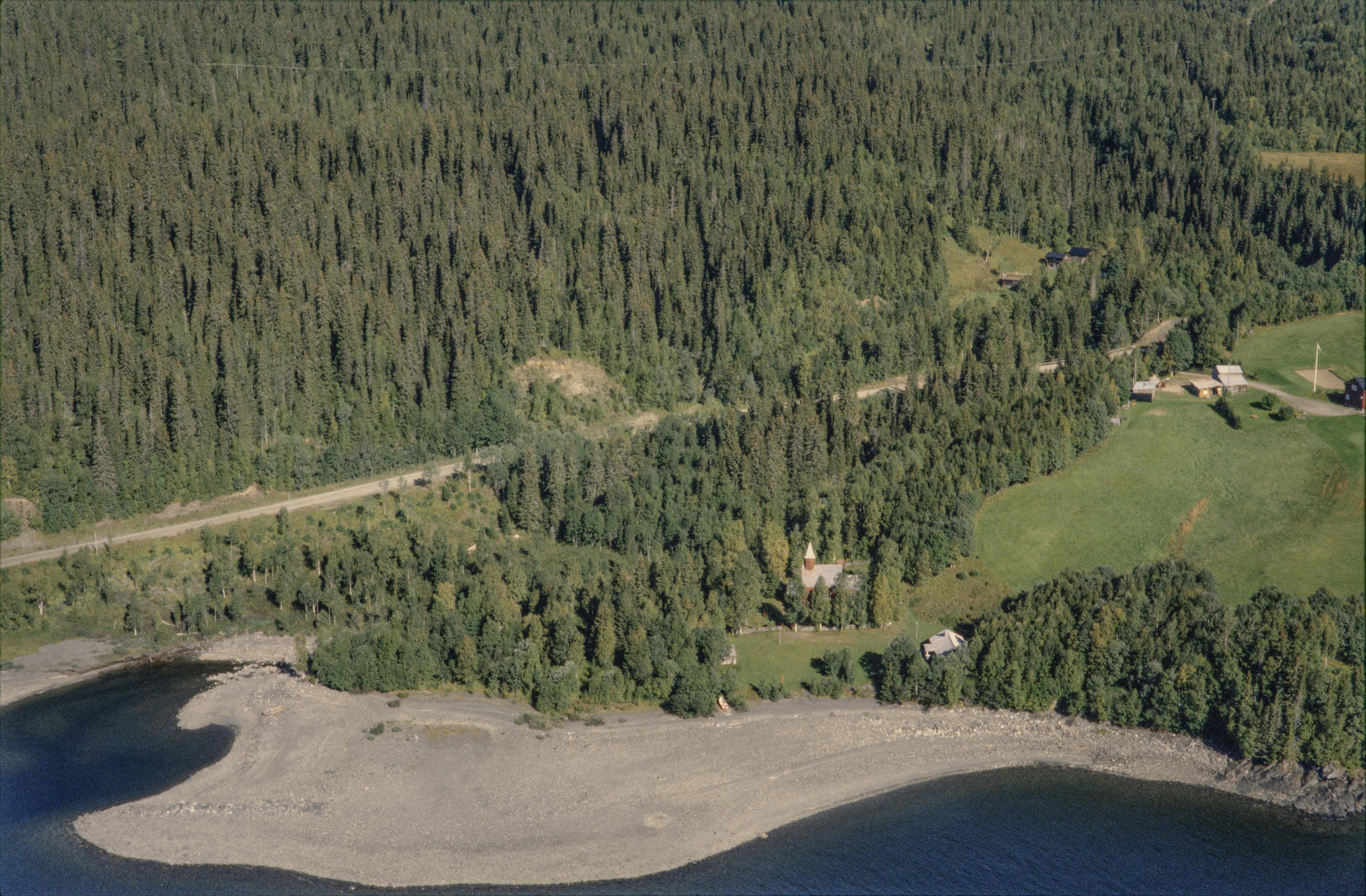 Beskrivning: Kyrkbyn Viken under Vikbergen i norra delen av Kvarnbergsvattnet i Ströms Vattudal. Till höger under bildens mitt Vikens kapell i boplats RAÄnr Frostviken 137:1 vid röse Frostviken 139:1. Bilden är tagen mot (väderstreck): N