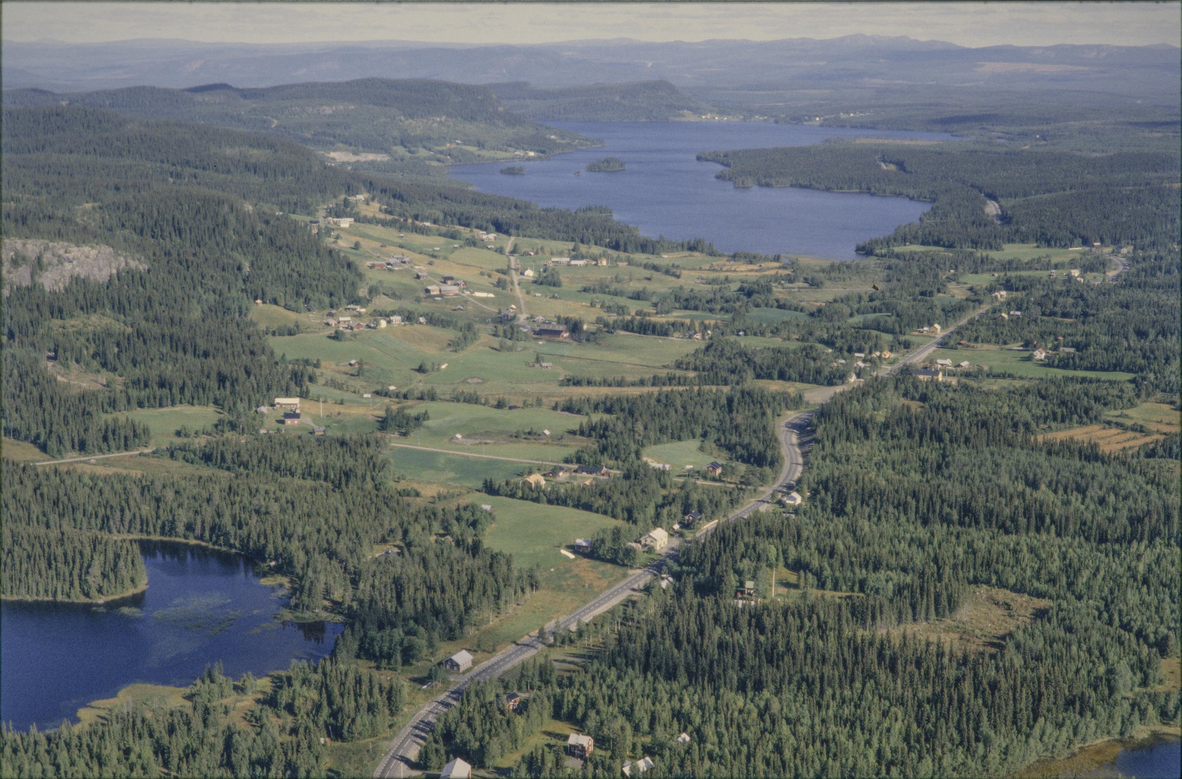 Beskrivning: I bildens nedre del sjön Gårdstjärn. Vid bildens mitt Skärvångens by med Skärvångens kapell, fångstgropar, boplats RAÄnr Föllinge 161:1 m.fl. I bildens övre del Skärvångssjön med hällmålningsområden vid byn Norra Skärvången. Bilden är tagen mot (väderstreck): N