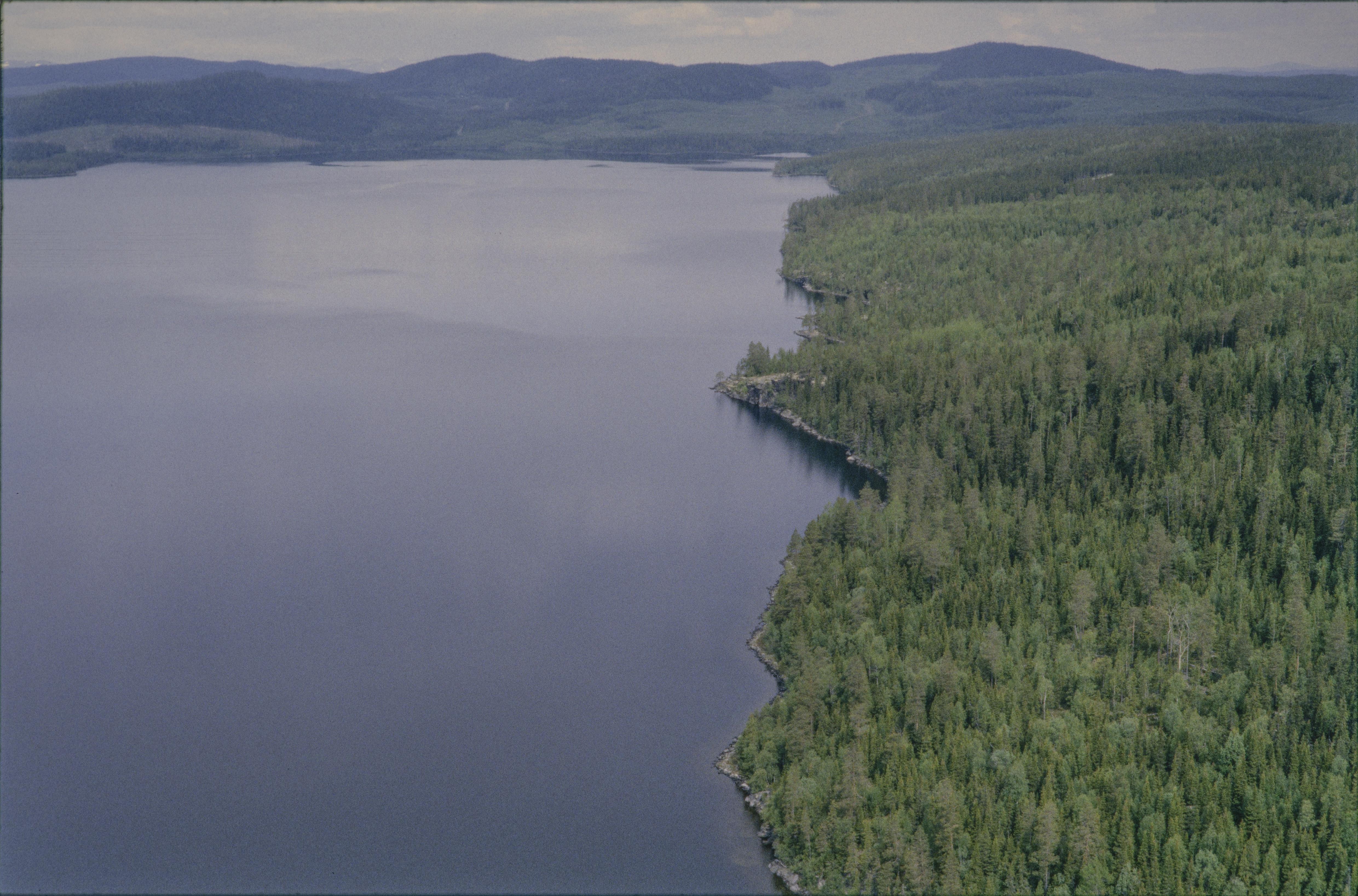 Beskrivning: Skärvångssjön norrväst om Norra Skärvångens by. Till höger om bildens mitt Brattberget med hällmålning RAÄnr Föllinge 346:1 under Nordsjöberget. Uppe till höger hällmålning RAÄnr Föllinge 346:1 vid Hällberget och boplats Föllinge 175:1. Bilden är tagen mot (väderstreck): NV