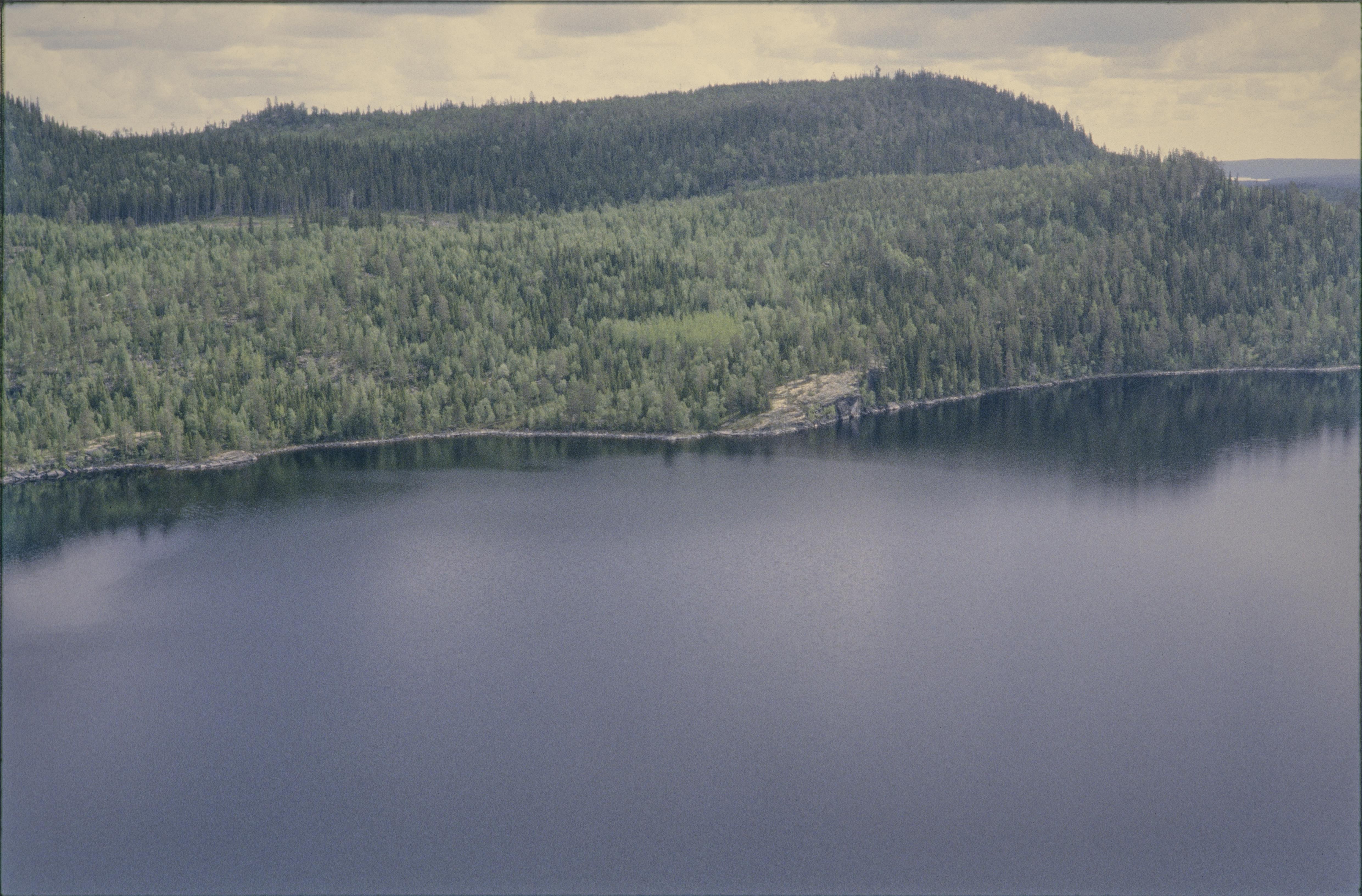 Beskrivning: Nordsjöberget vid Skärvångssjön norrväst om byn Norra Skärvången. Till vänster hällmålningar vid Hällberget RAÄnr Föllinge 1:1 och boplats Föllinge 175:1. Till höger om bildens mitt hällmålning Föllinge 346:1 vid Brattberget. Bilden är tagen mot (väderstreck): NO