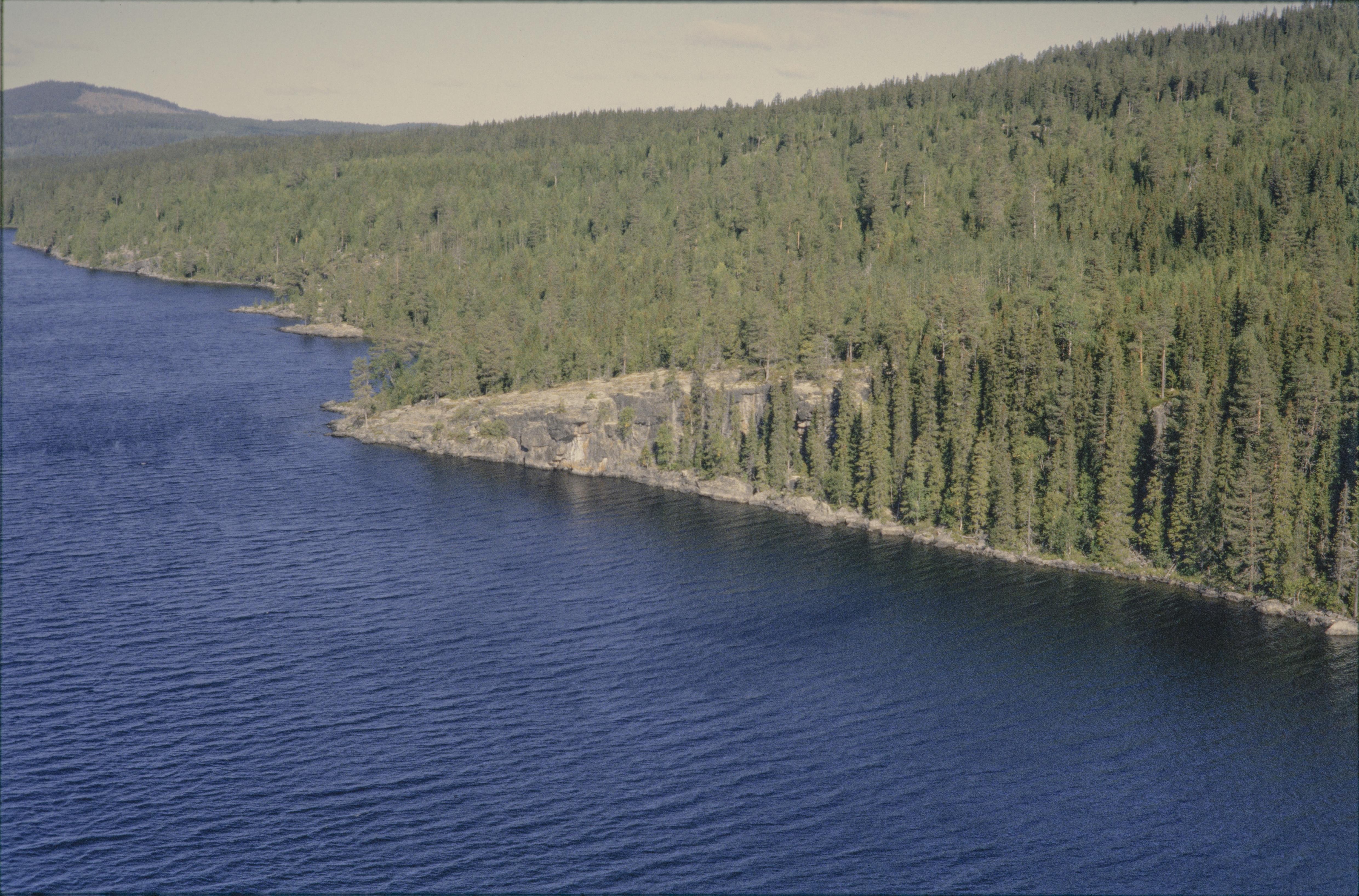 Beskrivning: Skärvångssjön norrväst om Norra Skärvångens by. Vid bildens mitt Brattberget med hällmålning RAÄnr Föllinge 346:1. Uppe till vänster hällmålning RAÄnr Föllinge 346:1 vid Hällberget och boplats Föllinge 175:1. Bilden är tagen mot (väderstreck): N
