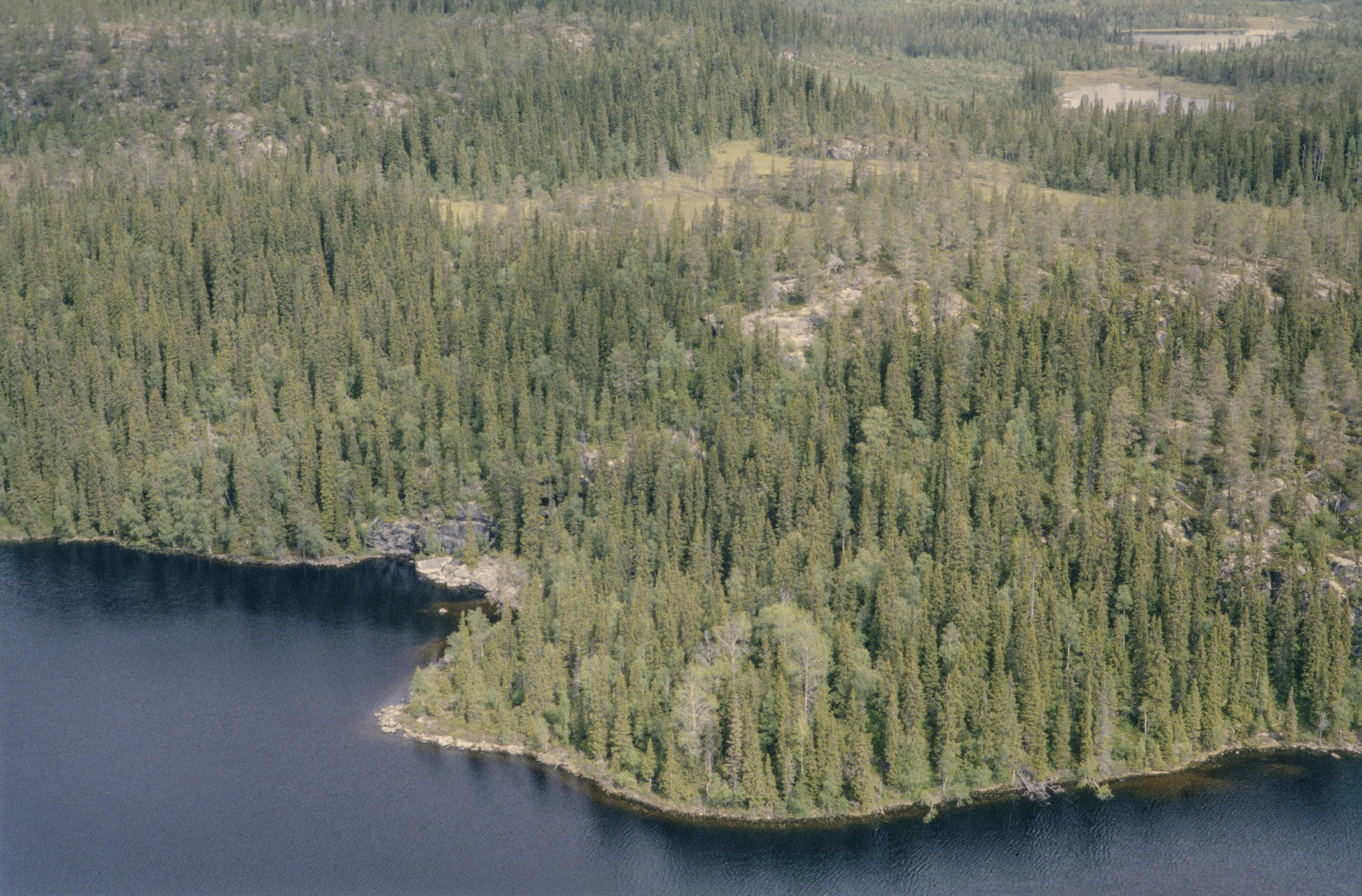 Beskrivning: Hästskotjärn (skrivs även Hästskotjärnen). Till vänster under bildens mitt en klippa med hällmålningar RAÄnr Kall 70:1-5 vid Kruseberget och sjöns norra strand. Bilden är tagen mot (väderstreck): NV
