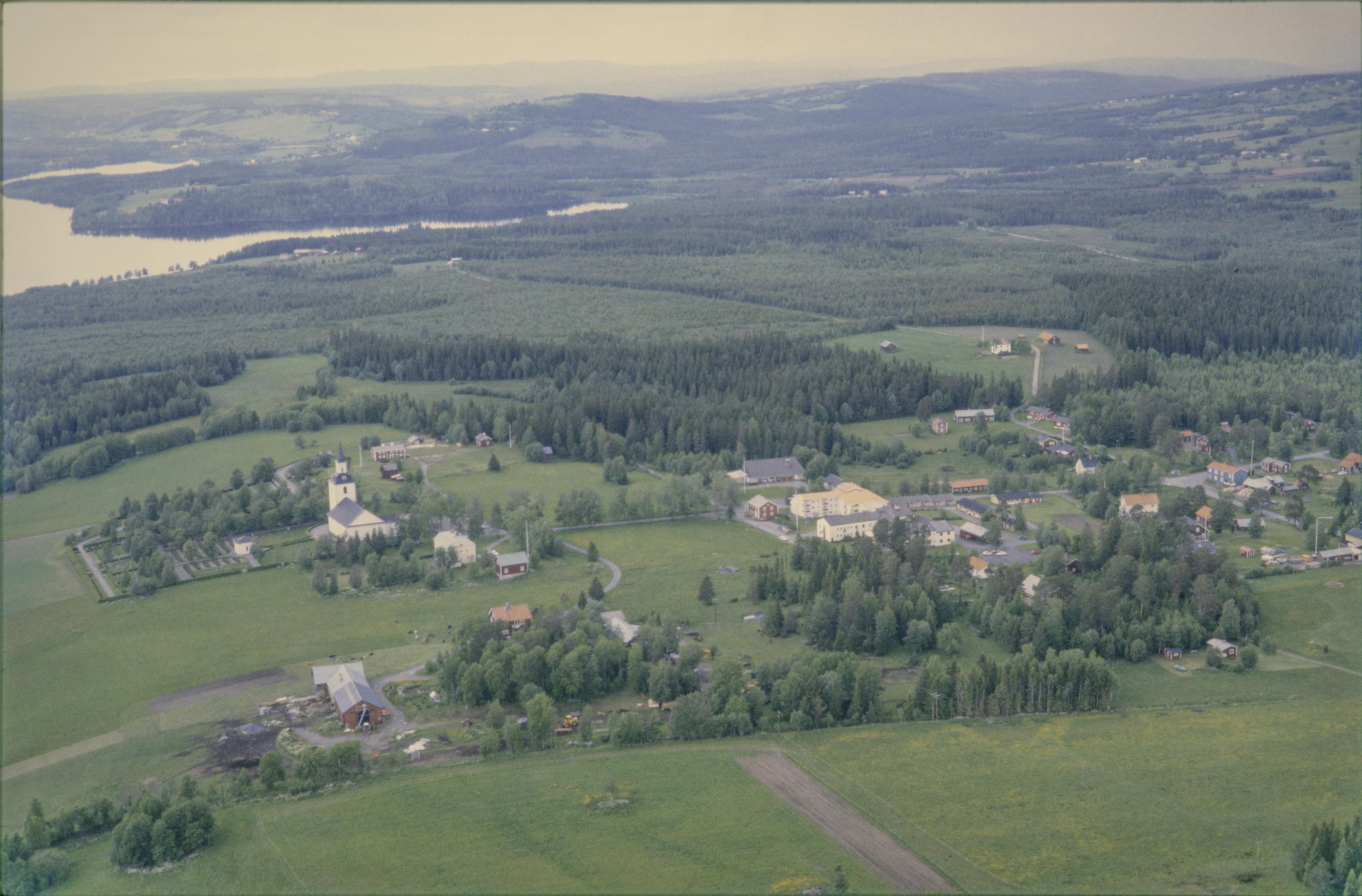 Beskrivning: Offerdals kyrkby vid Hällsjön. Offerdals kyrka över bildens mitt. Till höger om bildens mitt fossil åker RAÄnr Offerdal 322:1. Över bildens mitt ödesbölet Rösta med fossil åker RAÄnr Offerdal 85:1. Bilden är tagen mot (väderstreck): NV