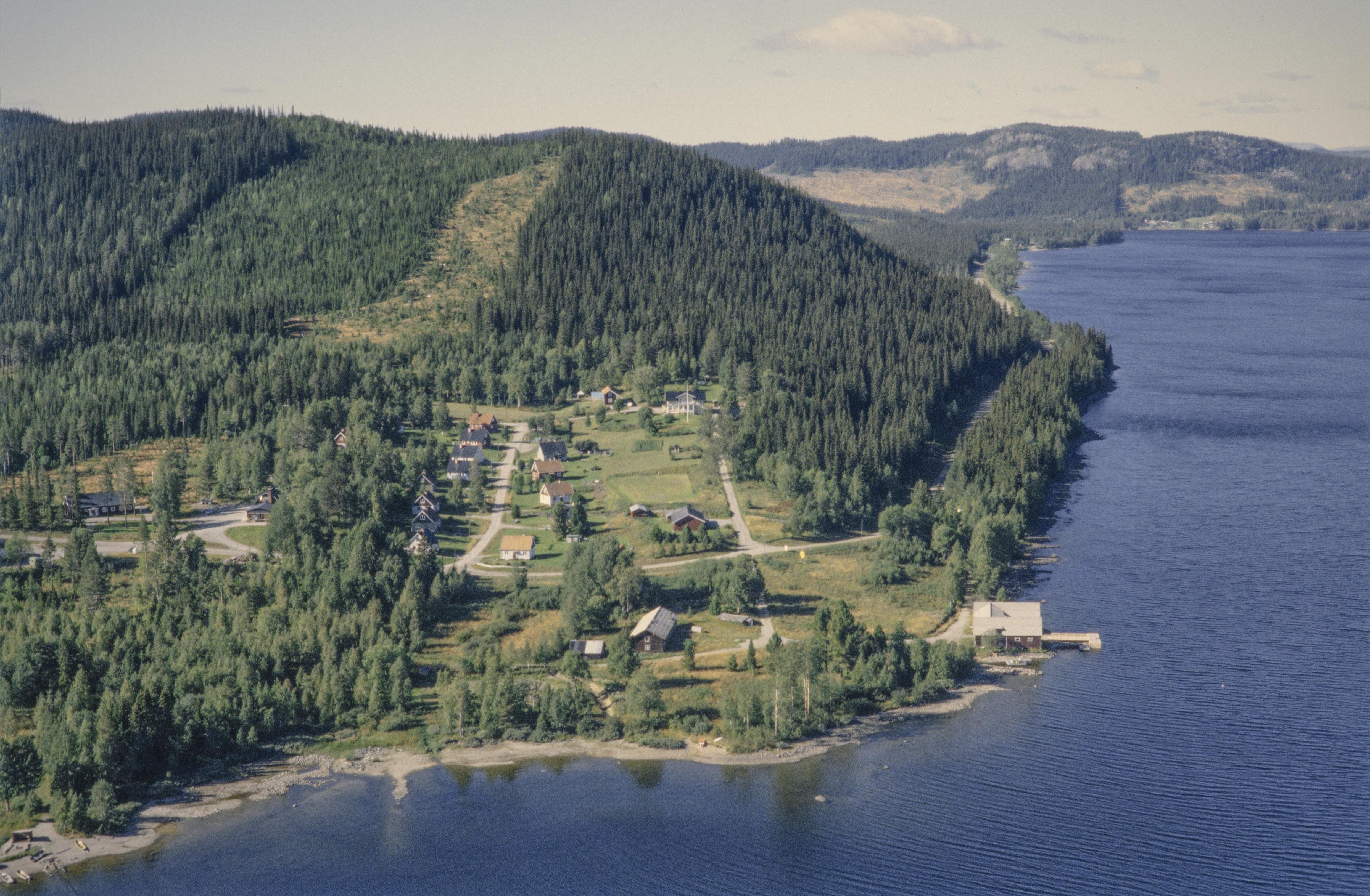Beskrivning: Hemberget och orten Svaningen med flottningsanläggning vid Svaningssjön. Bilden är tagen mot (väderstreck): VNV