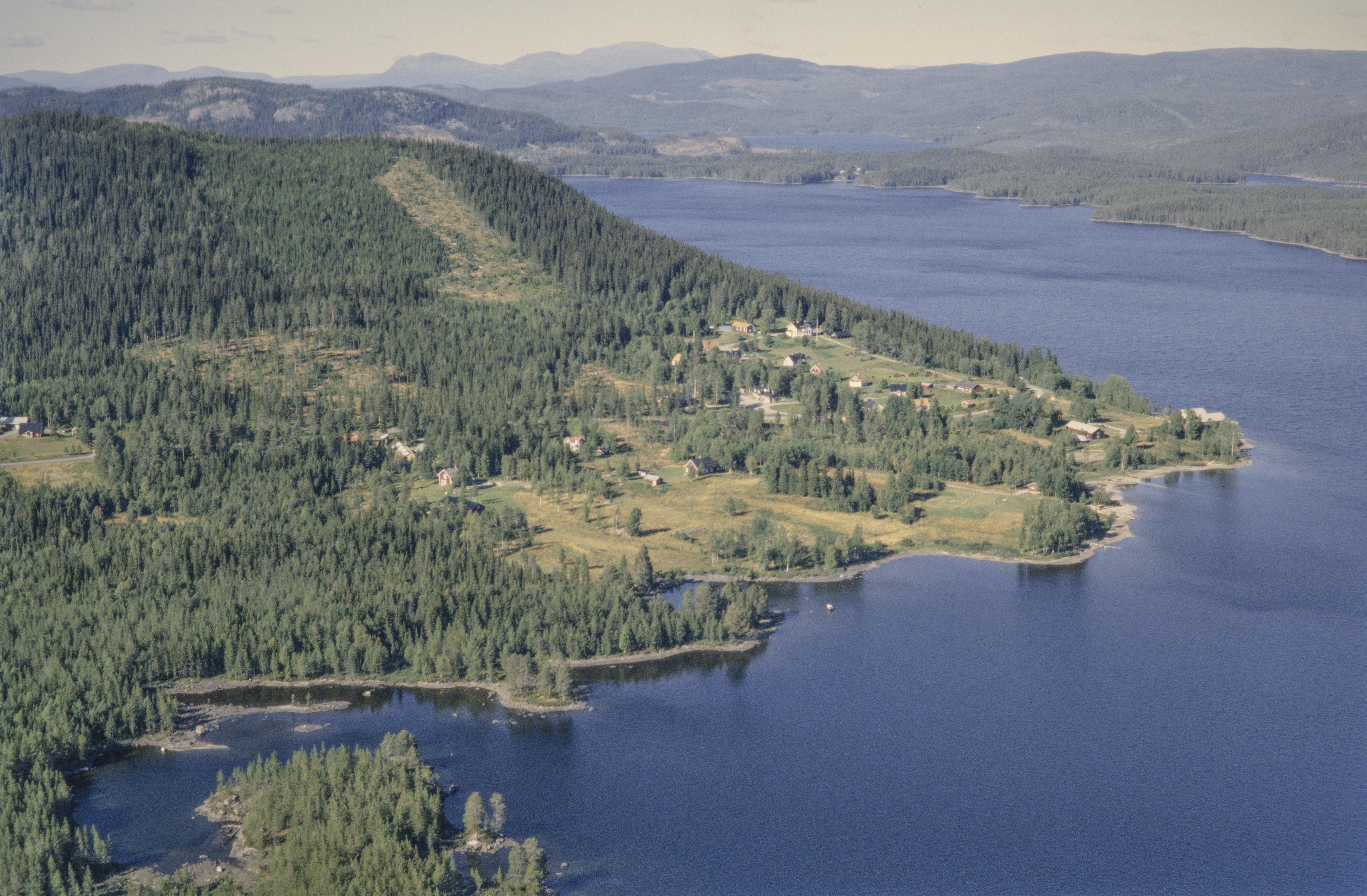 Beskrivning: Hemberget och orten Svaningen med flottningsanläggning vid Svaningssjön. Vid Svaningsåns mynning nere till vänster boplats RAÄnr Ström 14:1. Bilden är tagen mot (väderstreck): NNV