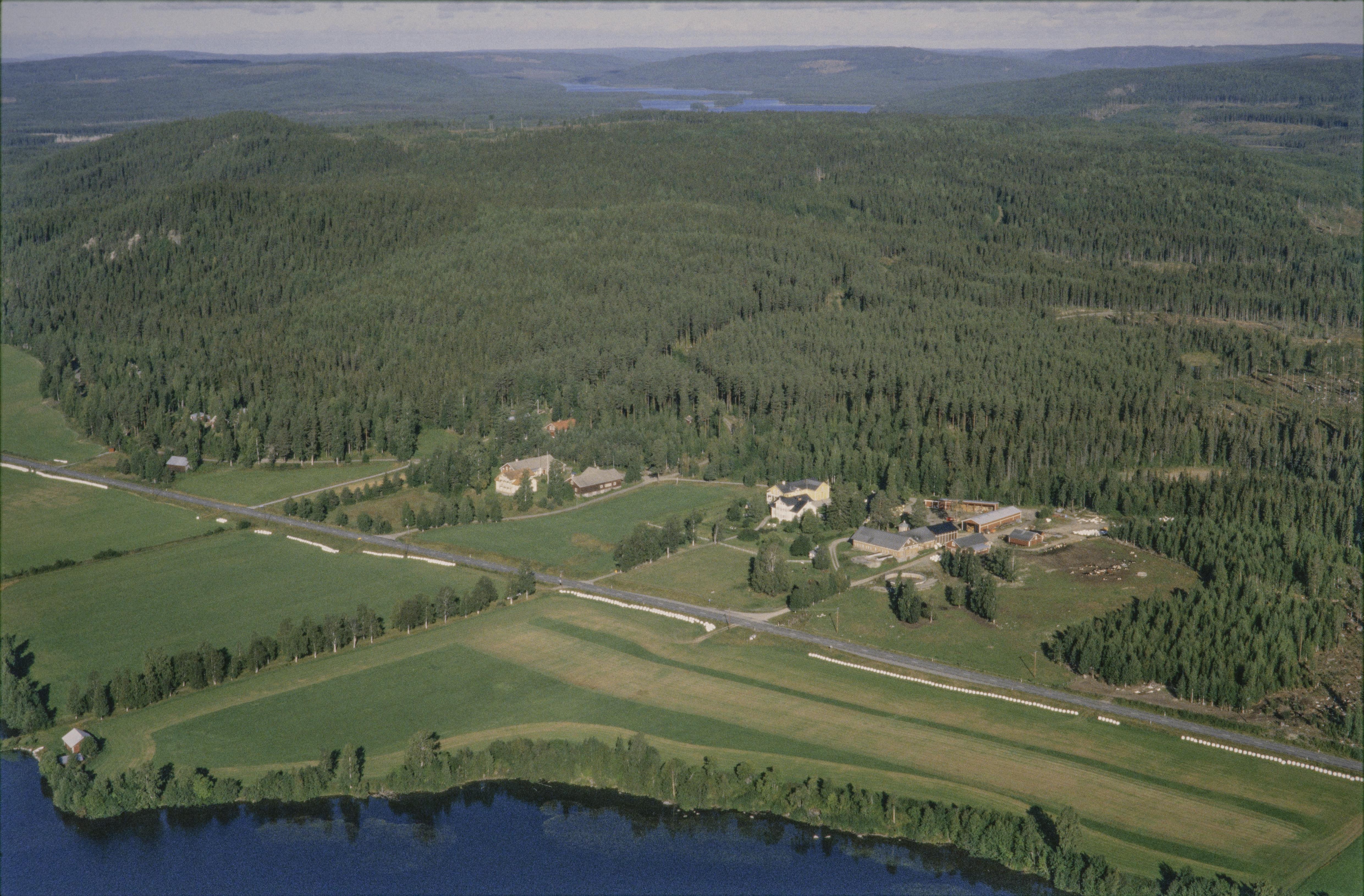 Beskrivning: Strånäsets by (med två storbondegårdar) vid Indalälven väster om sjön Gesunden. Nere i bildens högra hörn boplats RAÄnr Stugun 197:1. Bilden är tagen mot (väderstreck): NV